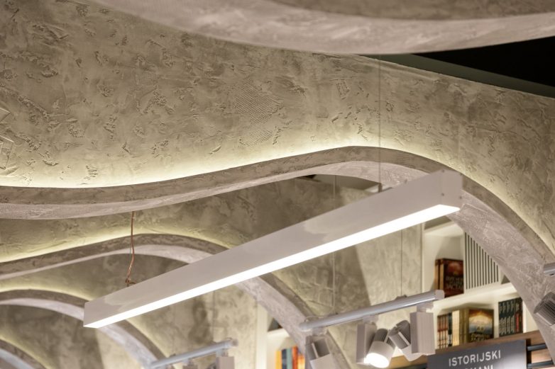 Ritam poprečnih ramova dodatno naglašava perspektivu i dubinu prostora navodeći korisnike da uđu u prostor. Takođe, na prvoj etaži ramovi imaju funkciju razdvajanja prostora u tri veće celine međusobno imaju različite funkcionalne teme. Geometriju prostora animira izraženi kontinuitet visokih knjižarskih polica kao i ostalih elemenata u prostoru.