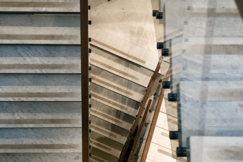 Veliko centralno stepenište kroz materijalizaciju tretirano tako da sugeriše funkciju na suptilan način.