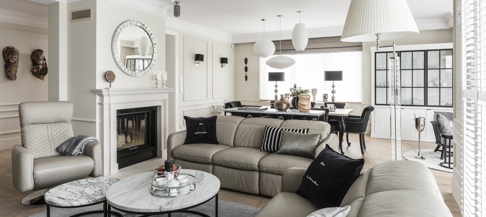 Bež kolorit, štukature na zidovima, interesantna rasveta i klasični komadi nameštaja dominiraju dnevnom sobom s pripadajućom trpezarijom. Iako je nameštaj stilske forme, i on i dalje u savremenom duhu što sve zajedno ovom prostoru daje toplu atmosferu.