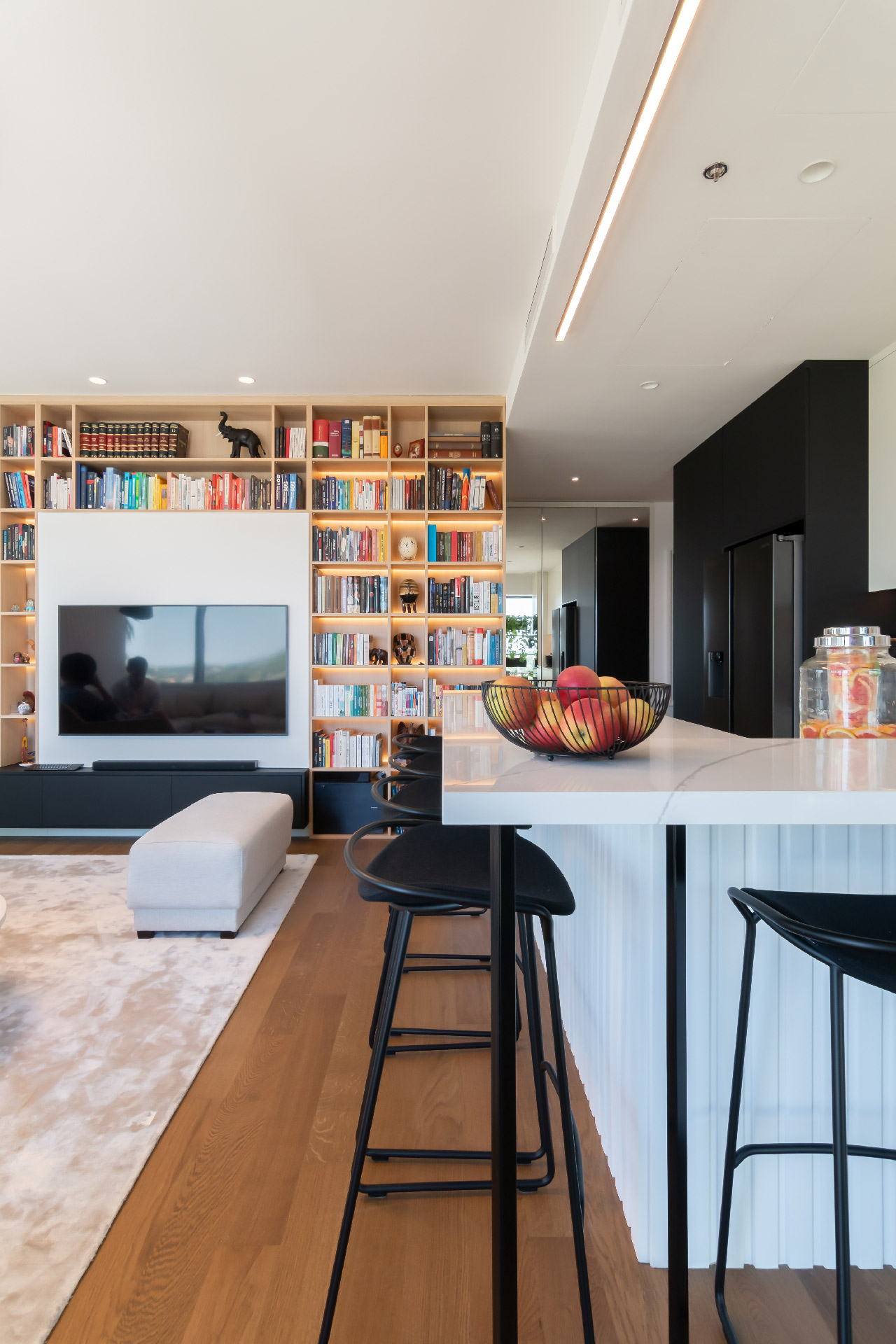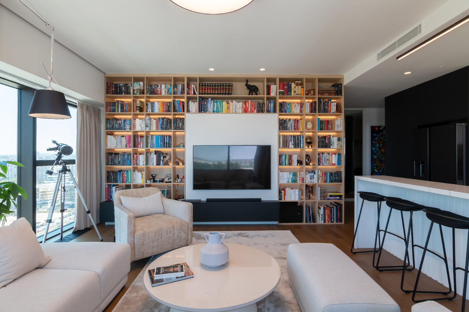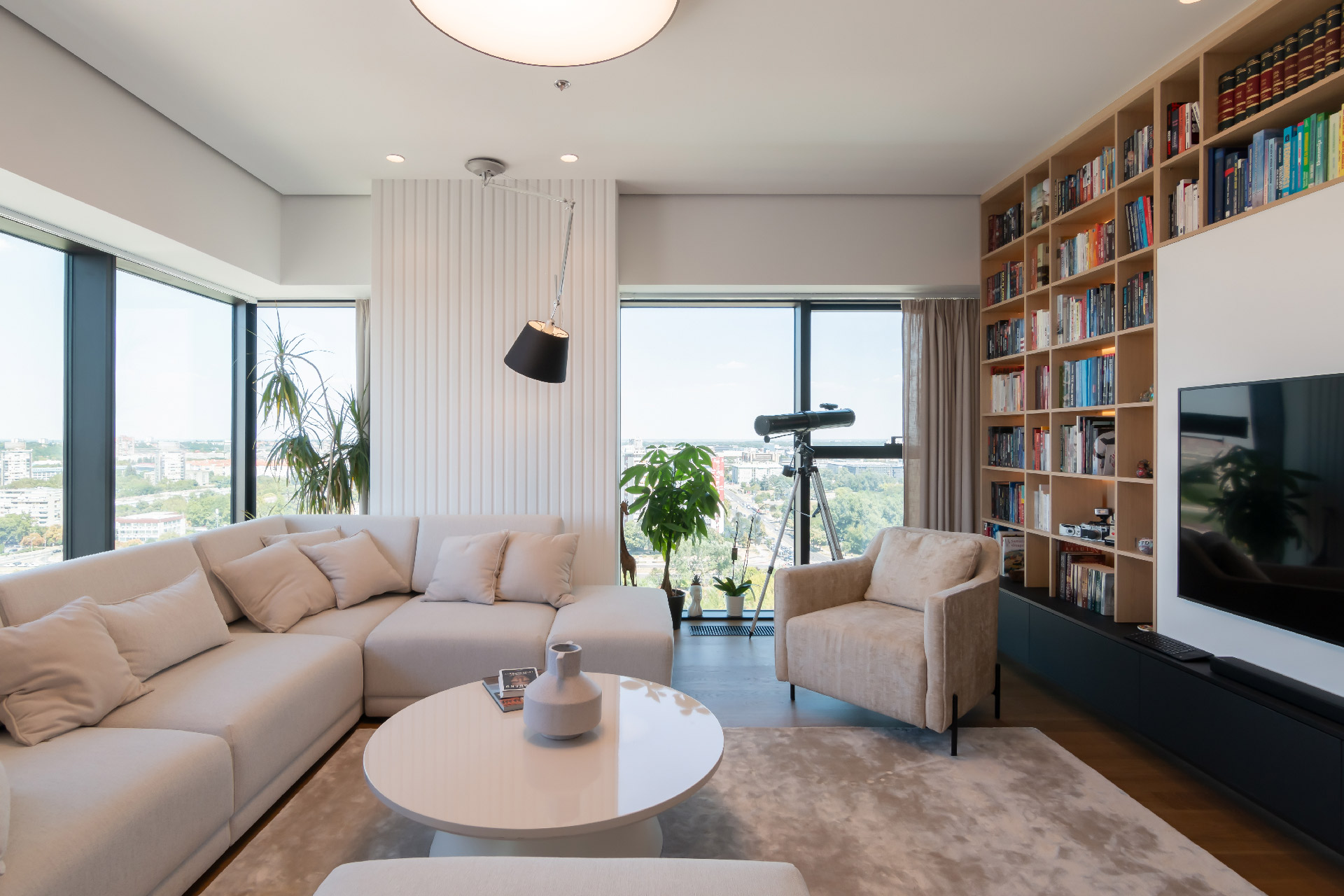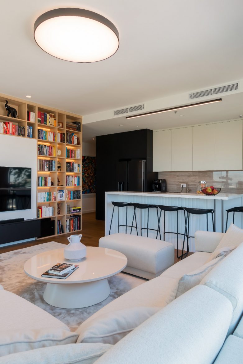 Vlasnik stana je veliki ljubitelj knjiga te je na najveći zid dnevne sobe oko TV-a smeštena velika bibilioteka sa pozadinskim LED svetlom.