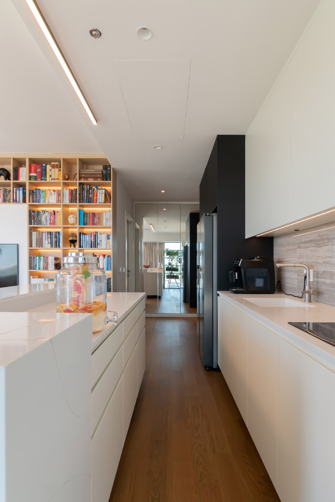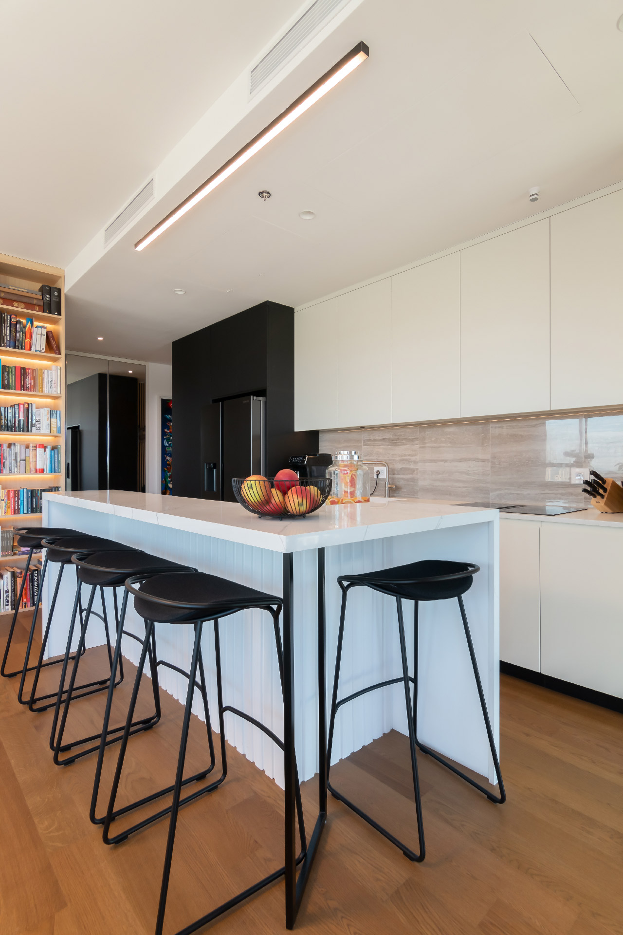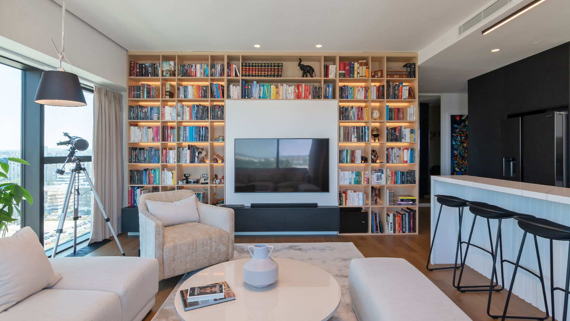 Vlasnik stana je veliki ljubitelj knjiga te je na najveći zid dnevne sobe oko TV-a smeštena velika bibilioteka sa pozadinskim LED svetlom.