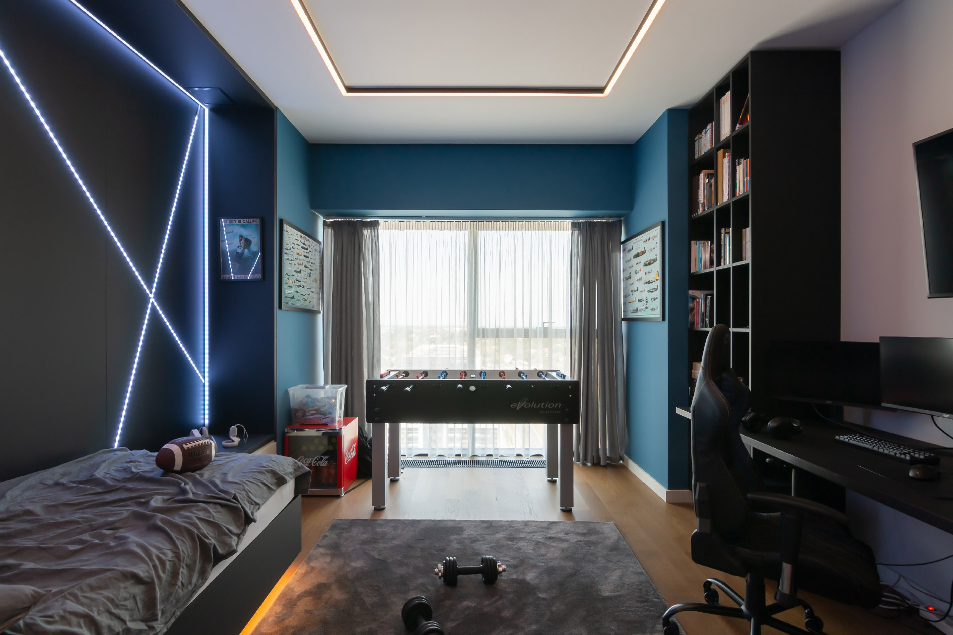 U dečijoj sobi se pored stonog fudbala smestio i veliki TV kao i dva monitora za računar.