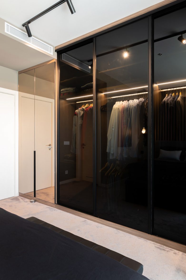 Iza kreveta su postavljene drvene letvice, a sa bočnih strana dim ogledalo bakarnog tona. Isti ovi materijali korišćeni su i na frontovima ormana u koje je ugrađeno LED svetlo.