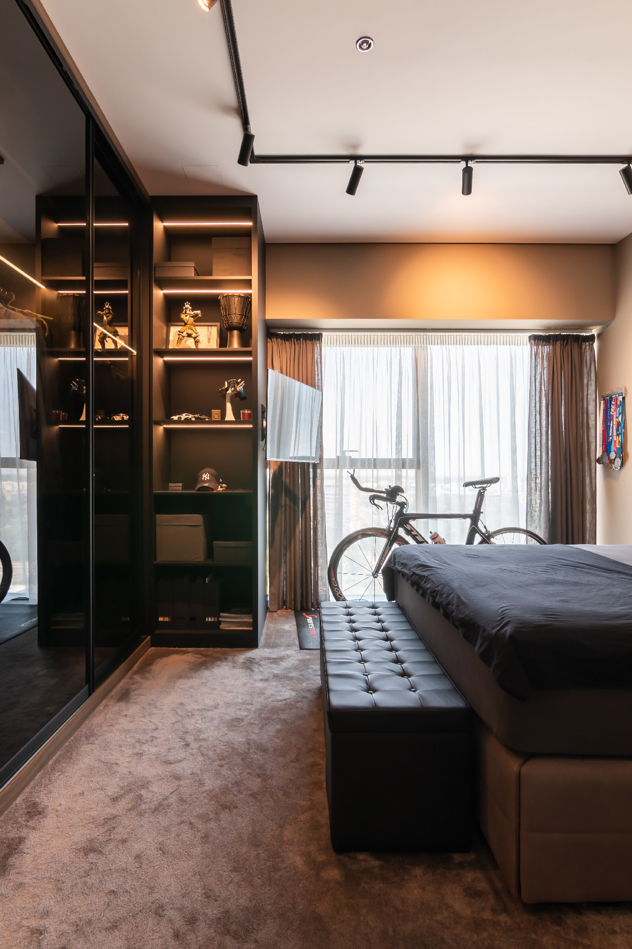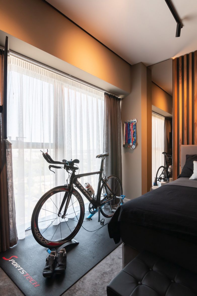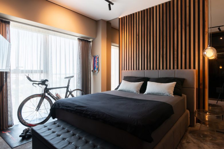 Master soba je takođe izvedena u tamnijim tonovima, a zahtev vlasnika jeste bio i smeštanje trenažnog bicikla u sobi. Bicikl je našao mesto pored prozora naspram kojeg je postavljen manji ekran koji pomaže vežbanju.