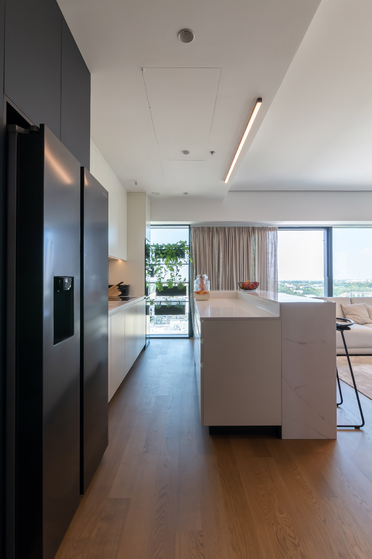 S obzirom na to da je plafon u kuhinji spušten u odnosu na ostatak stana, zbog smeštanja instalacija, iznad šanka je postavljena jednostavna linijska rasveta, crni profil sa LED trakom.