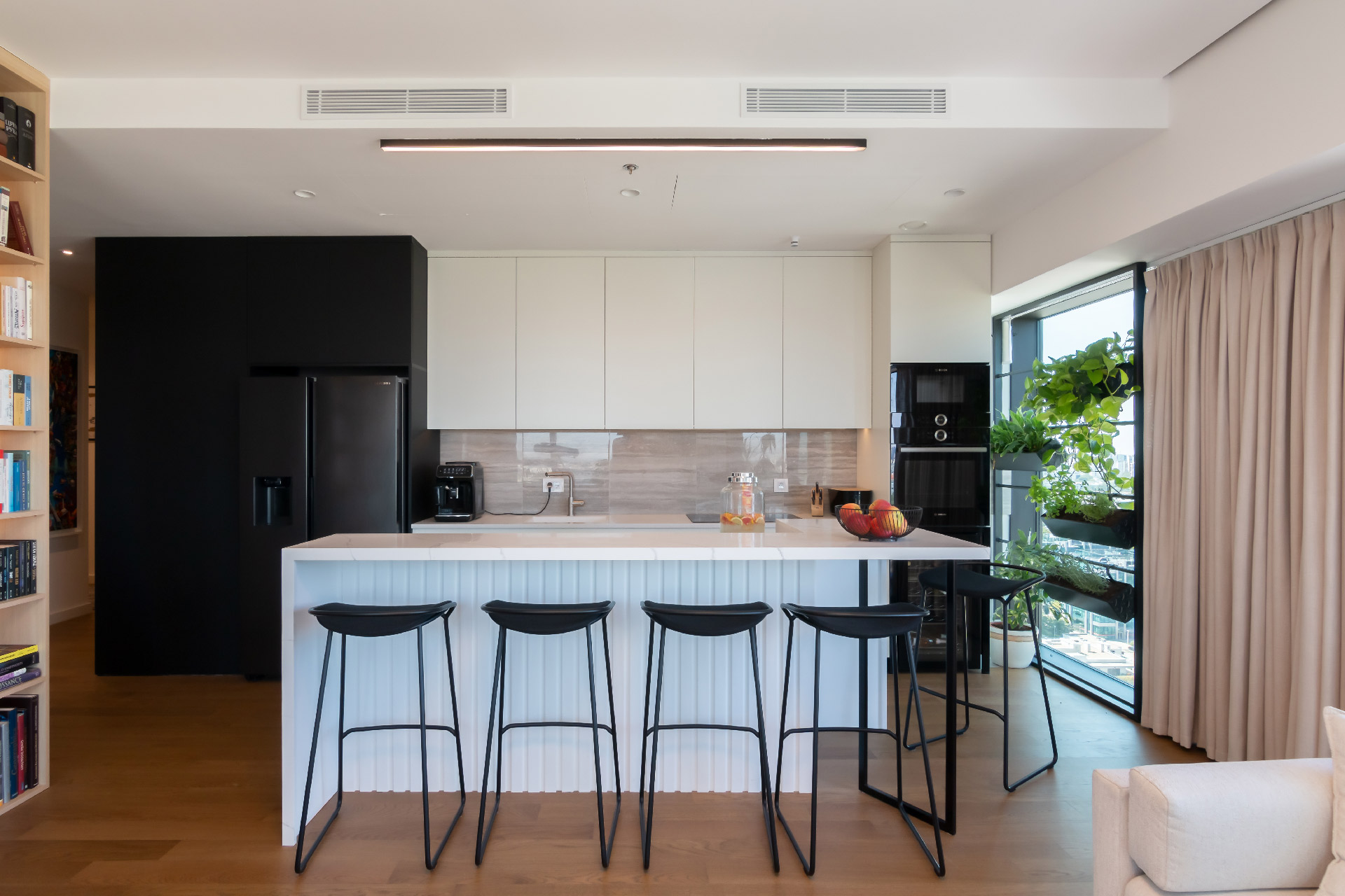 Kuhinja je napravljena po meri u kombinaciji belog MDF-a i crnog antifinger univera. Radna ploča izvedena je od Kerrocka, a na šank je stavljen mermer.