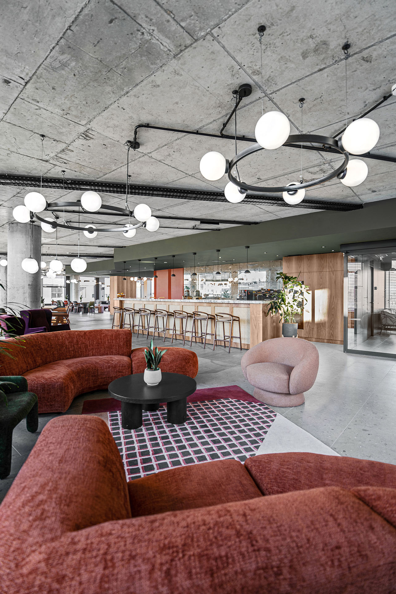 Međutim, s poboljšanjem epidemiološke situacije, sada je jedan od glavnih ciljeva klijenta bio je da kreira prostor koji će privući zaposlene nazad u prostorije kompanije, ali na takav način da se oni tu prvenstveno osete prijatno, udobno i da se, na neki način, prenese duh kućne atmosfere. Takođe, zahtev je bio da prostor ne izgleda korporativno.