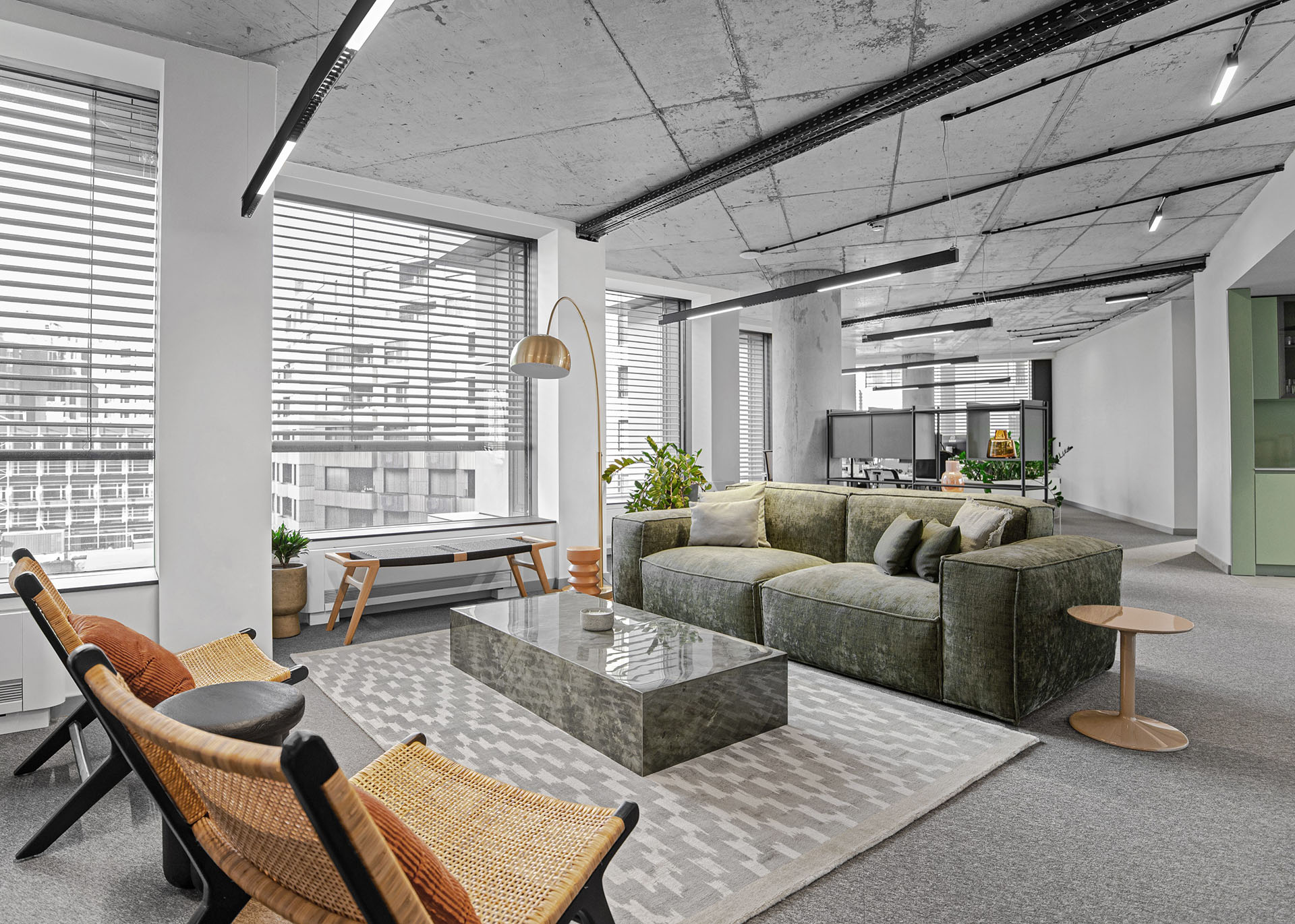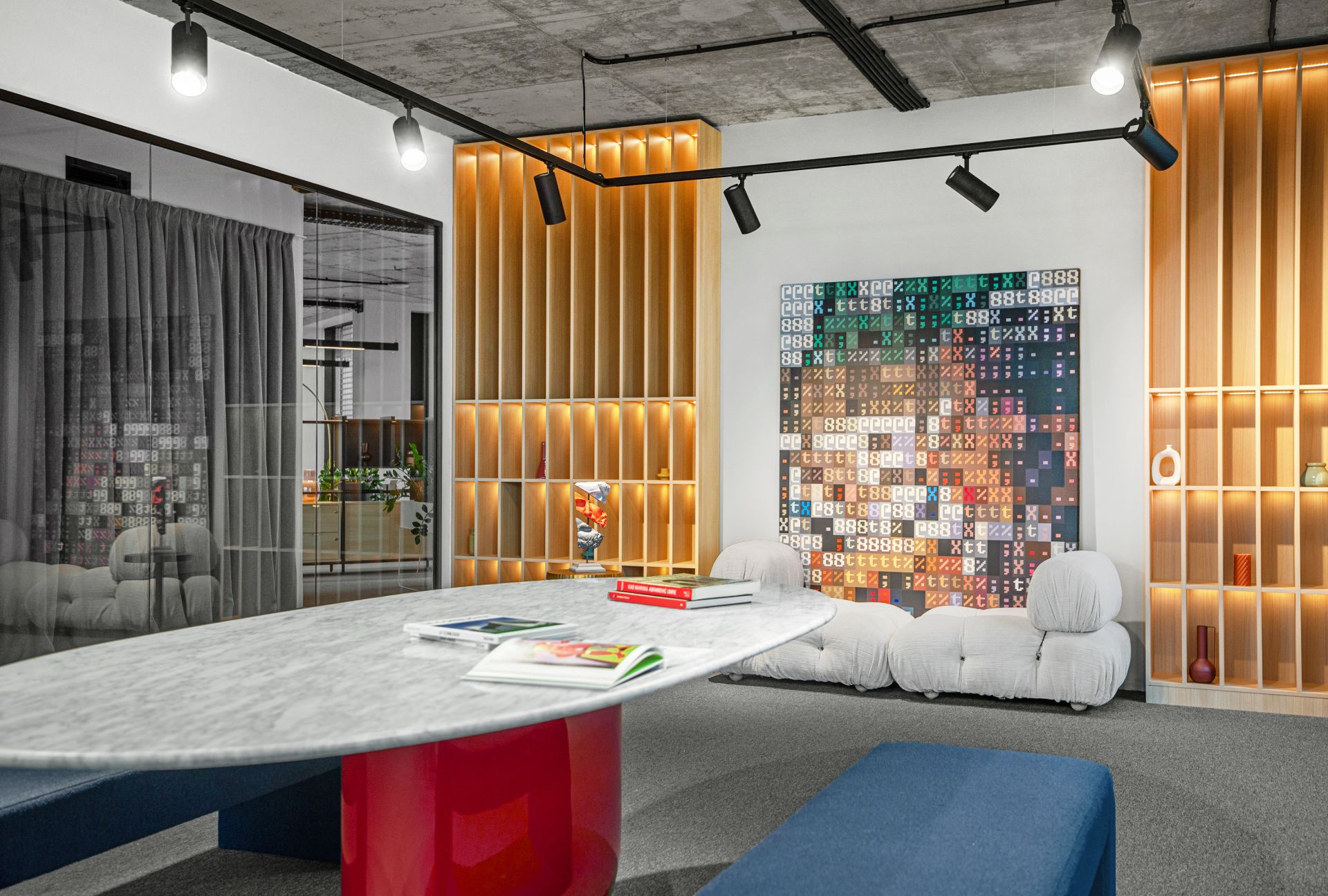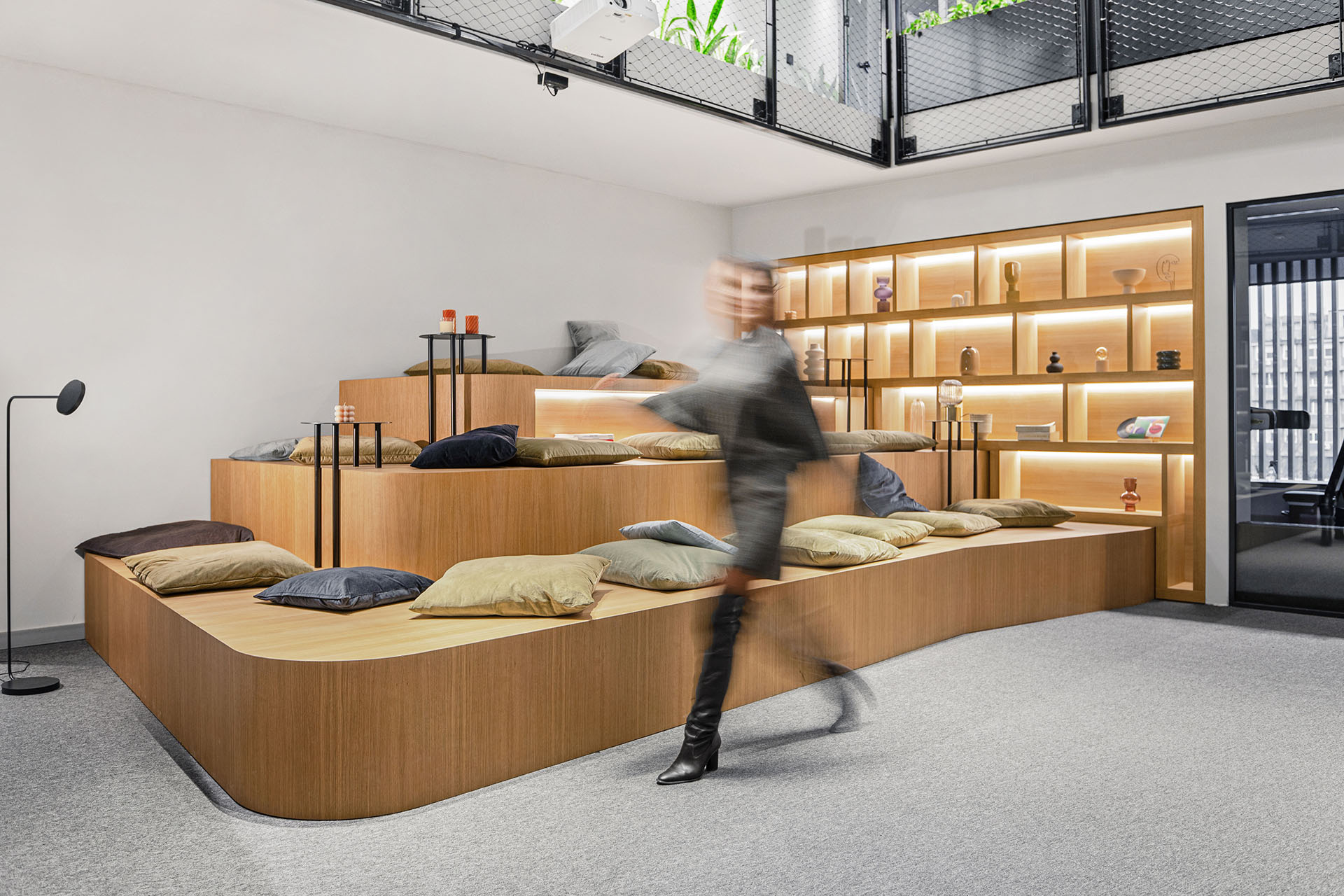 Ljušturu prostora čine velike staklene površine, betonski plafon, jednobojni itisoni, funkcionalna rasveta i jednostavni zidovi, dok su onda mikroceline oplemenjene tepisima, sofama i foteljama sa ekscentričnim teksturama i materijalima.