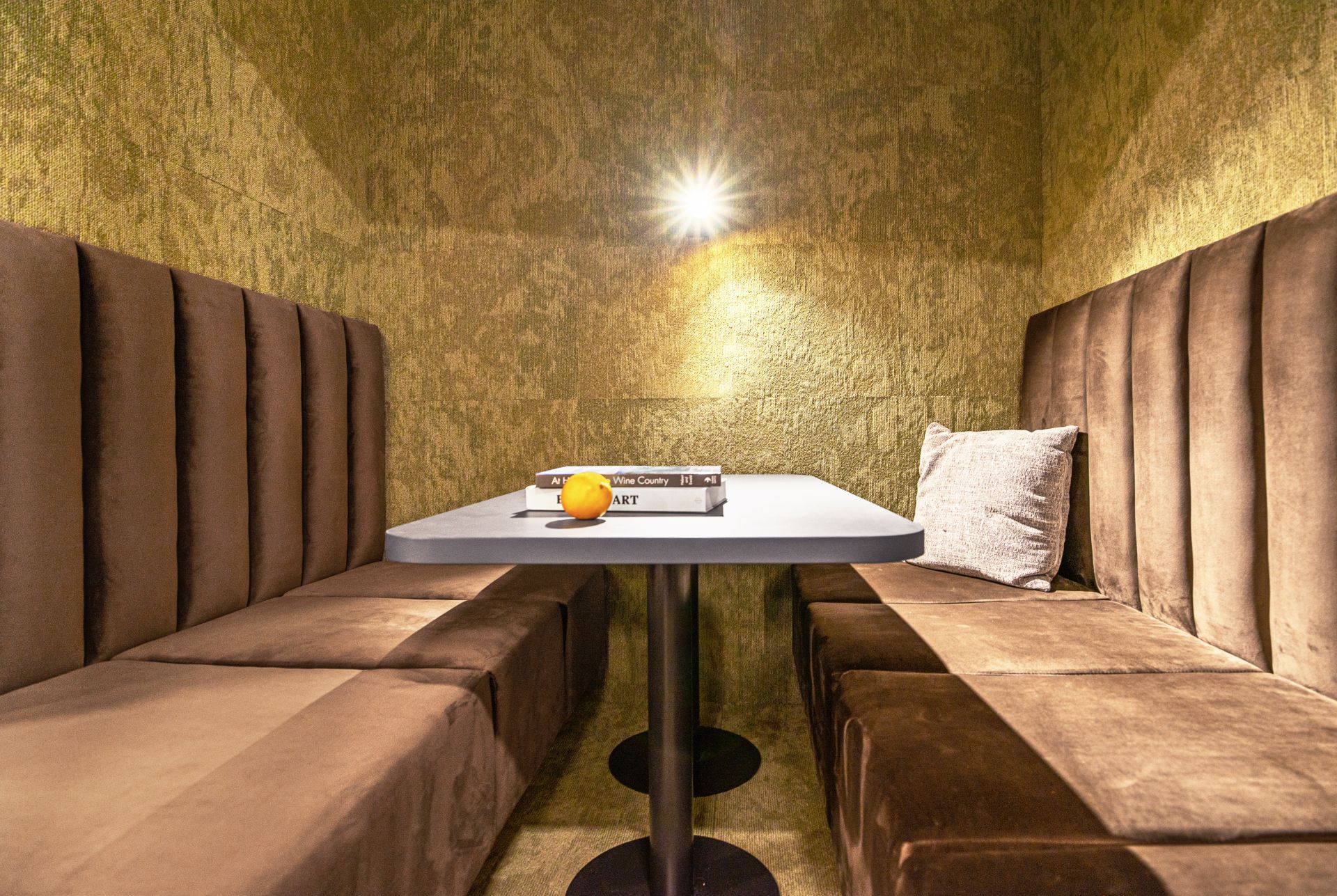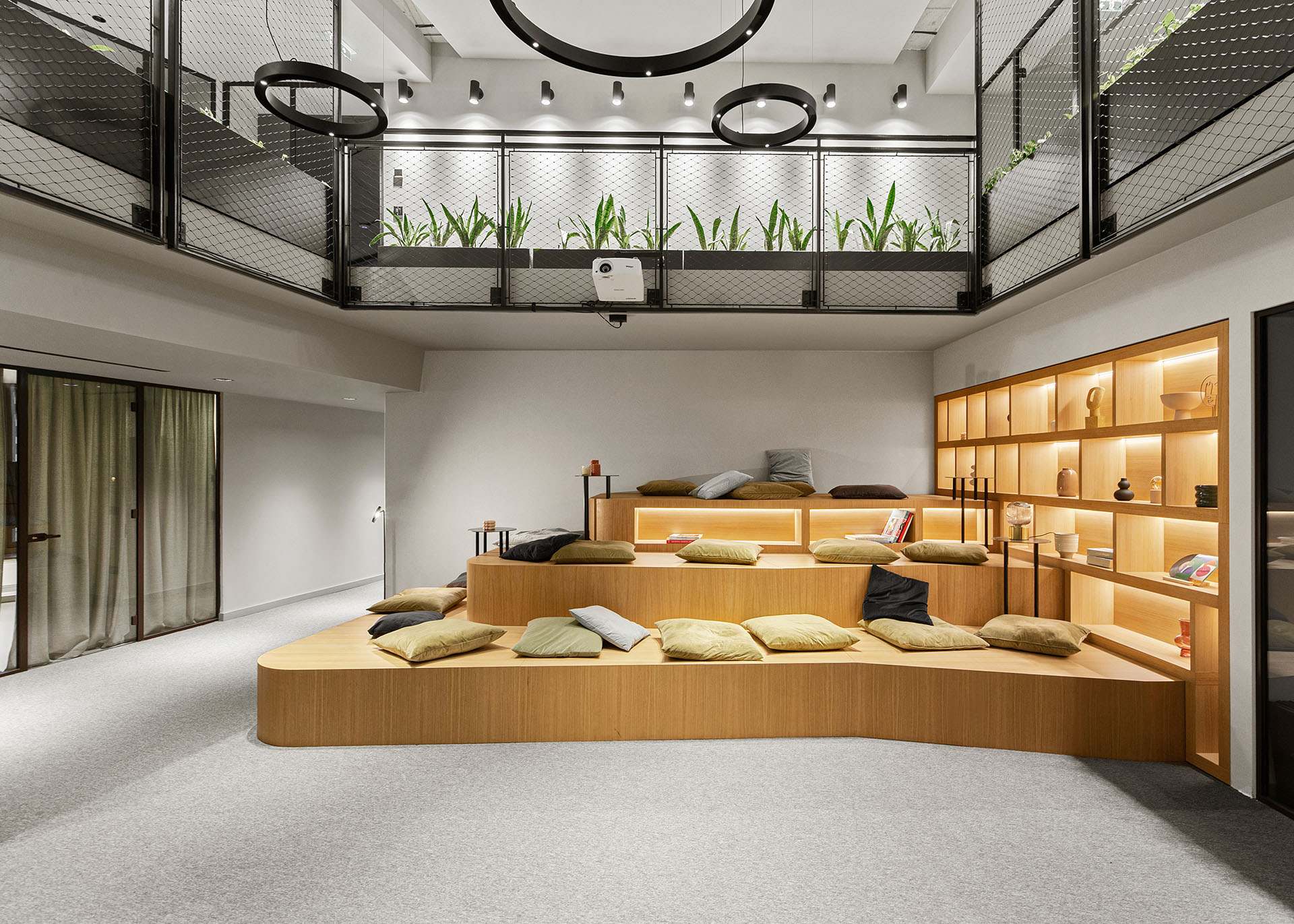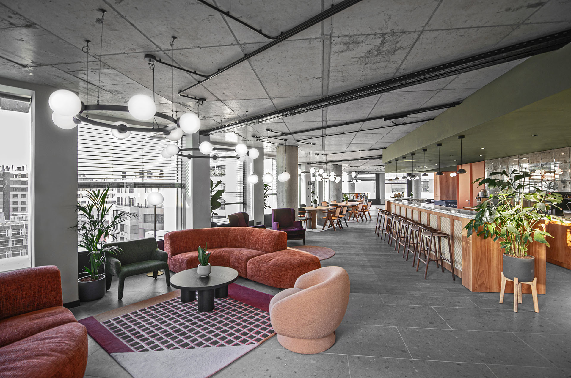 Ljušturu prostora čine velike staklene površine, betonski plafon, jednobojni itisoni, funkcionalna rasveta i jednostavni zidovi, dok su onda mikroceline oplemenjene tepisima, sofama i foteljama sa ekscentričnim teksturama i materijalima.