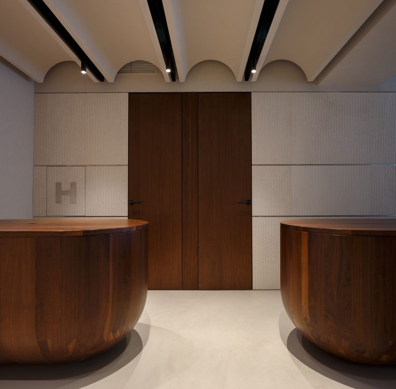 Preko zidova, podužno, kamen presecaju tanke inoks lajsne, koje doprinose luksuznom izgledu i valorizaciji ukupnog ambijenta i proizvoda. Kontrast svetloj opni su drvene police, vrata i nameštaj od oraha. Kako bi se dodatno umekšao prostor, duž čitave fasade se nalaze zavese od prirodnog materijala u tonu koji prati celokupni ambijent.