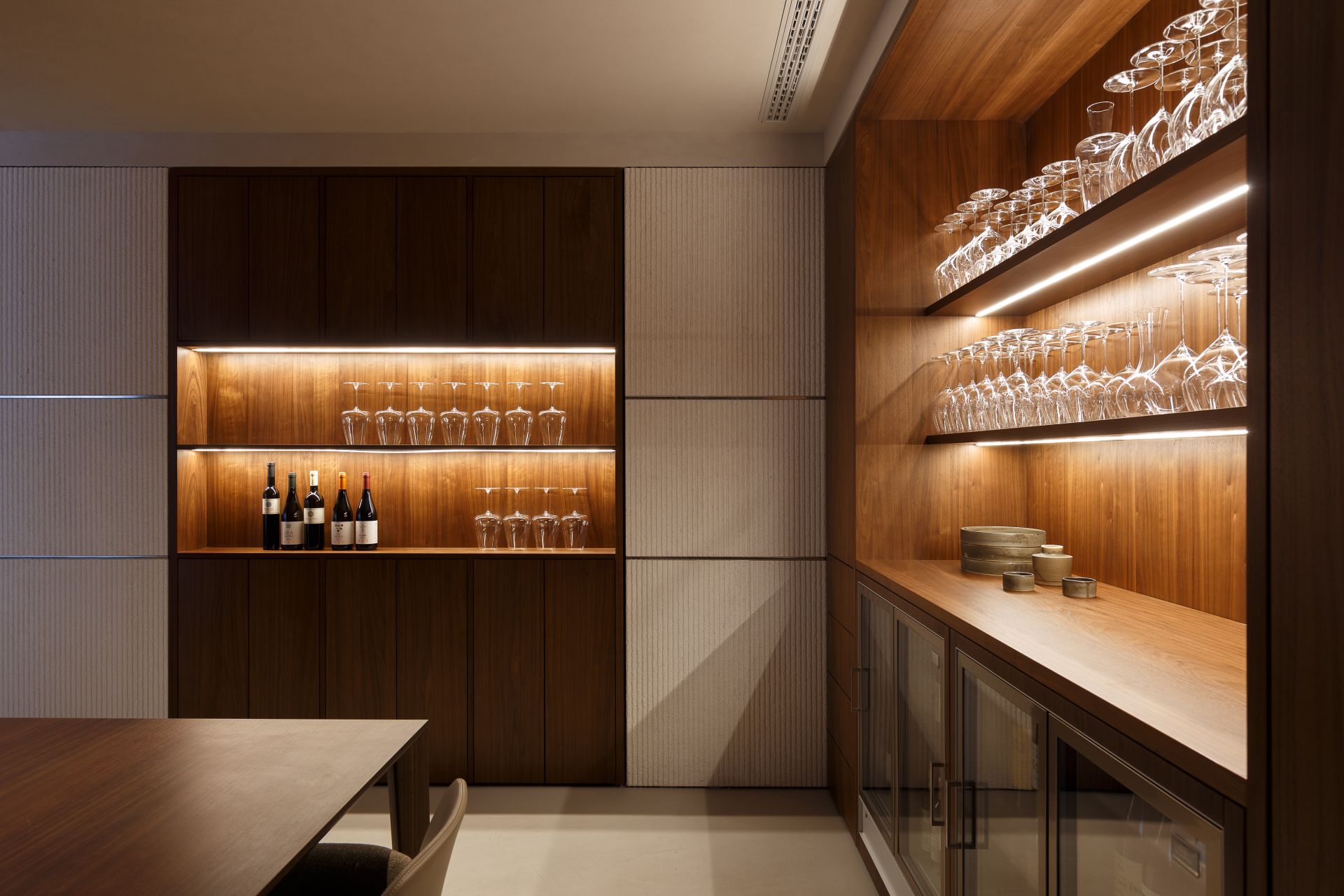 Preko zidova, podužno, kamen presecaju tanke inoks lajsne, koje doprinose luksuznom izgledu i valorizaciji ukupnog ambijenta i proizvoda. Kontrast svetloj opni su drvene police, vrata i nameštaj od oraha. Kako bi se dodatno umekšao prostor, duž čitave fasade se nalaze zavese od prirodnog materijala u tonu koji prati celokupni ambijent.