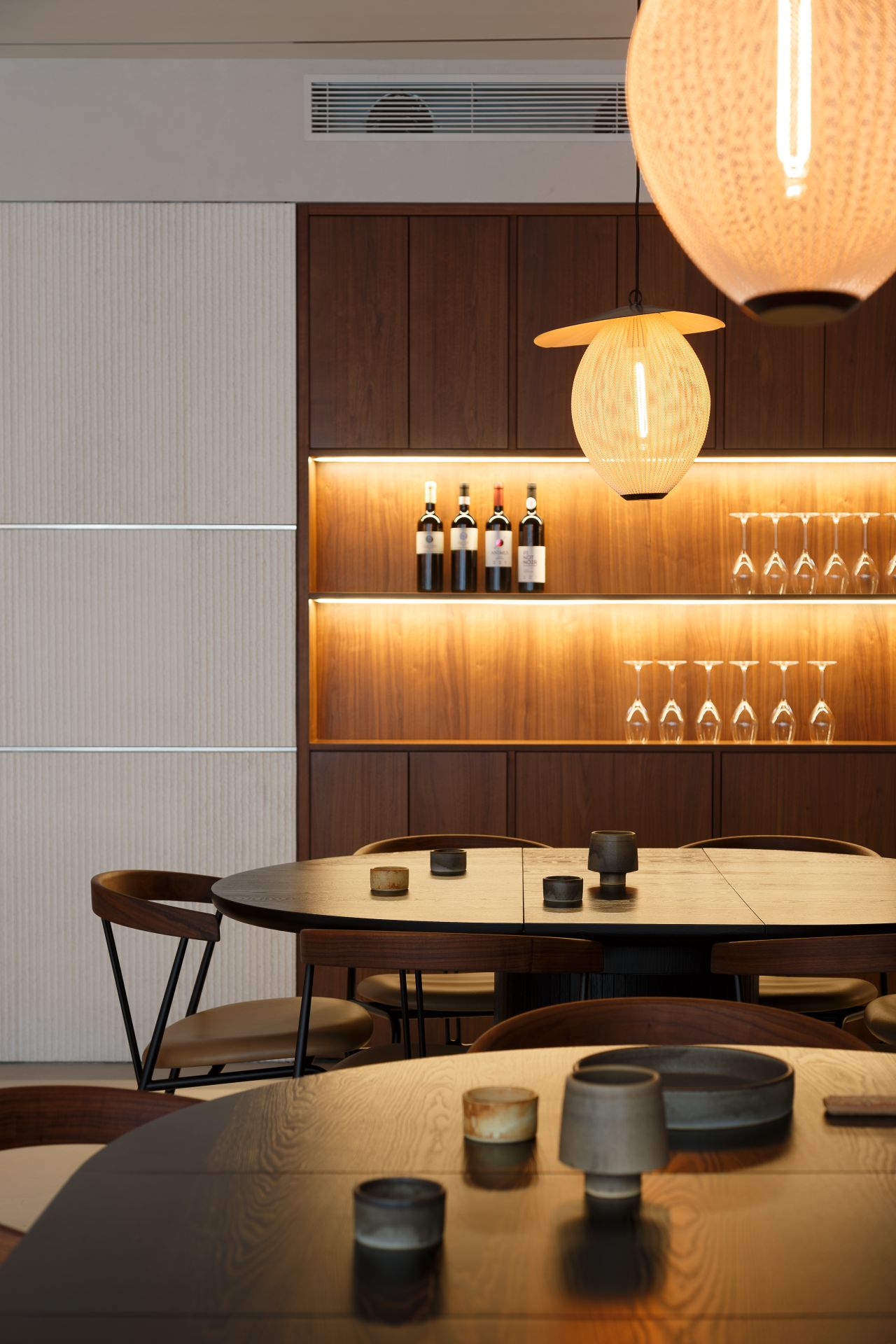Lukovi se nalaze ovešani o plafon iznad šanka koji je smešten u centru prostora, smanjujući čistu visinu pod/plafon, prave dodatnu teskobu u najtamnijem delu prostora i tako referišu na podrume vina iz vremena imperatora koji su bili na ovim prostorima.