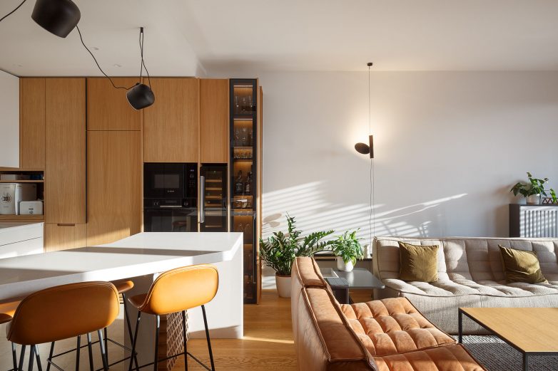 S druge strane, dnevna zona aktivnosti koju čine ulazni deo, kuhinja sa trpezarijom i dnevni boravak sa lođom rešeni su kao total dizajn koji prati jednu jasnu estetsku liniju. Svi sekundarni elementi prate ton i teksturu hrastovog drveta, dok su ostali elementi u beloj ili crnoj boji.