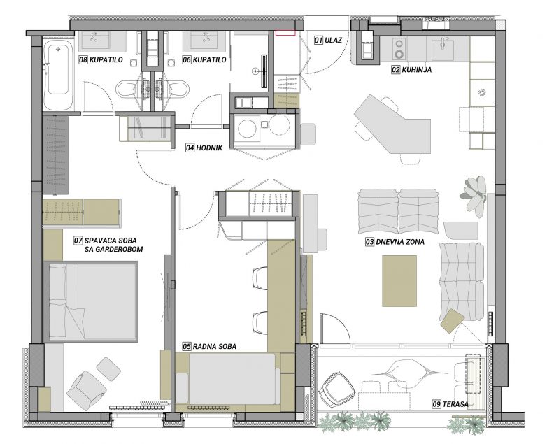 U noćnoj zoni izdvaja se glavna spavaća soba sa prostranim garderoberom i pripadajućim kupatilom koje je funkcionalno organizovana. Radna soba je nešto manja, ali pruža mogućnost neometanog rada od kuće. Njen karakter i namena naznačeni su kroz prisustvo dve kancelarijske stolice i radnog stola.
