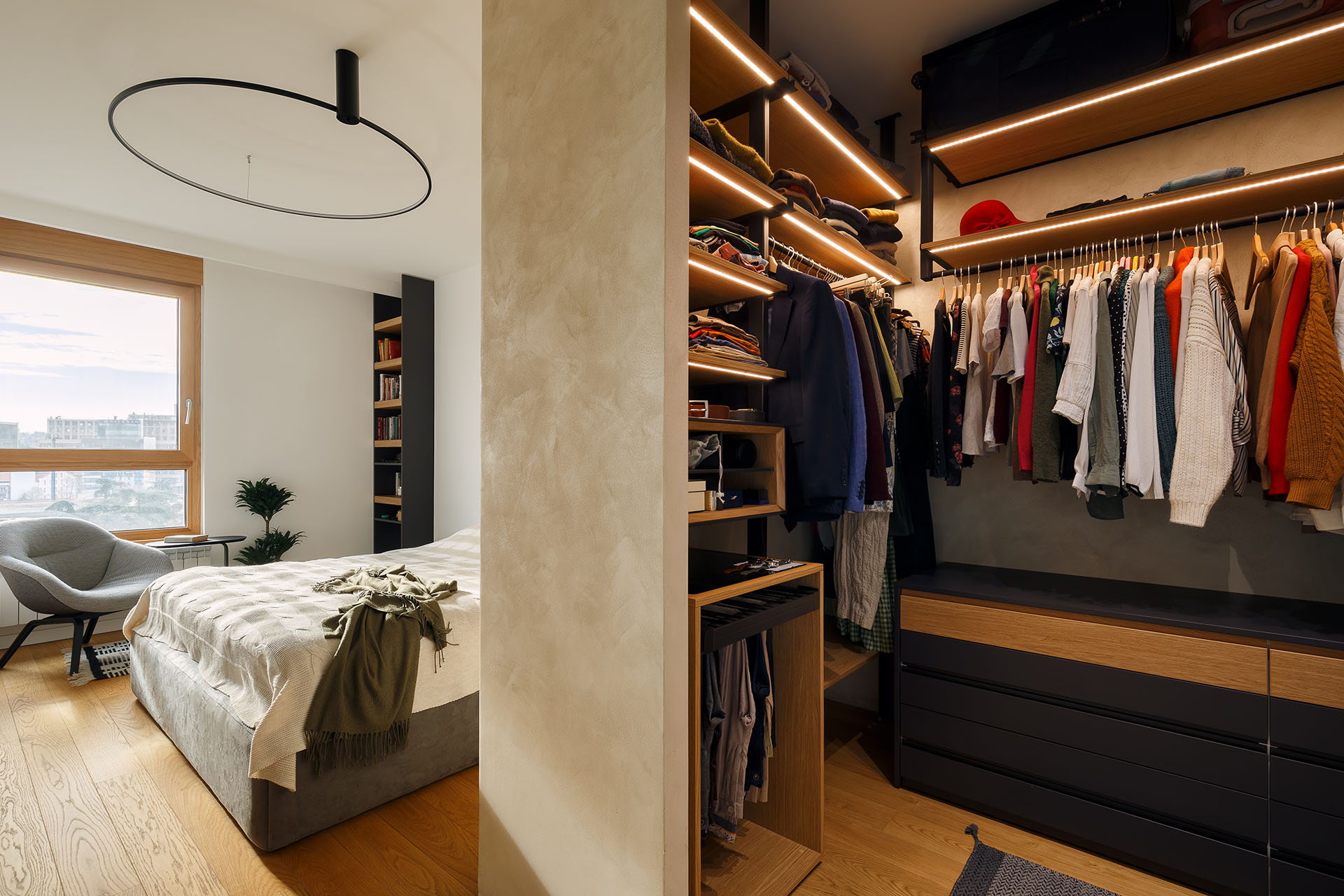 Ovaj enterijer prilagođava zatečeno stanje generičke osnove stvarnim potrebama klijenta, a na način da u nasleđeni okviru unese dodatnu dinamiku i toplinu.