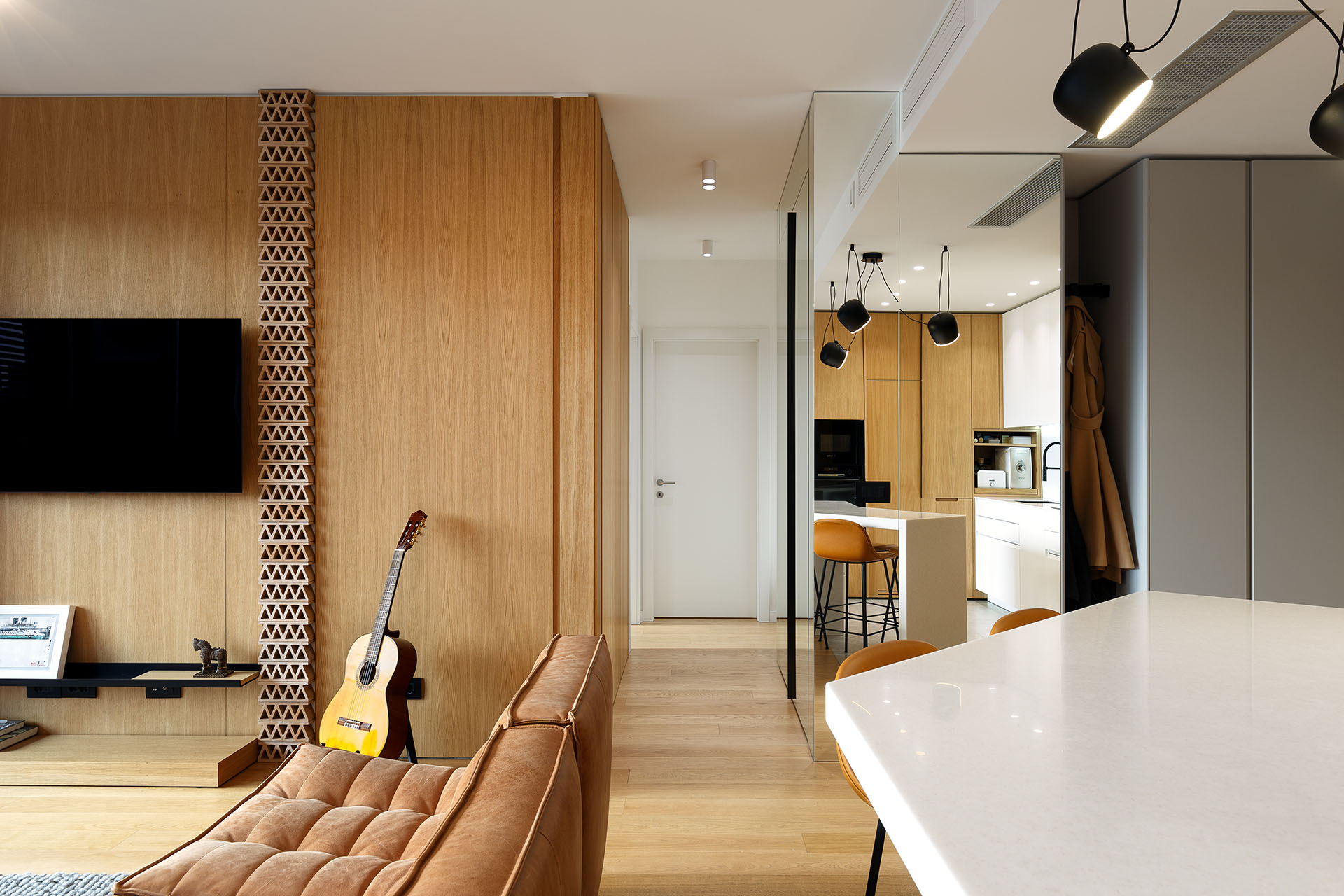 S druge strane, dnevna zona aktivnosti koju čine ulazni deo, kuhinja sa trpezarijom i dnevni boravak sa lođom rešeni su kao total dizajn koji prati jednu jasnu estetsku liniju. Svi sekundarni elementi prate ton i teksturu hrastovog drveta, dok su ostali elementi u beloj ili crnoj boji.