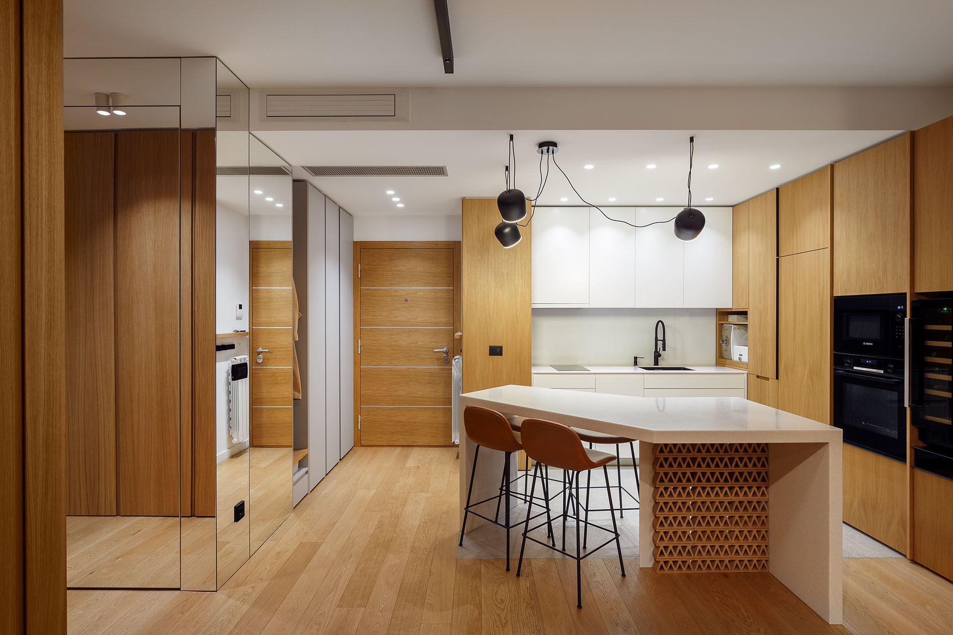 Posebna atrakcija ovog dela stana čini kuhinja sa izdvojenim ostrvom nepravilne geometrije. Postavka ovog elementa u kontekstu „otvorenog plana“ dnevnog boravka prostoru daje karakter polivaletnosti. Mogućnost kružne veze skučenom prostoru daje notu fleksibilnosti.