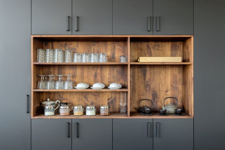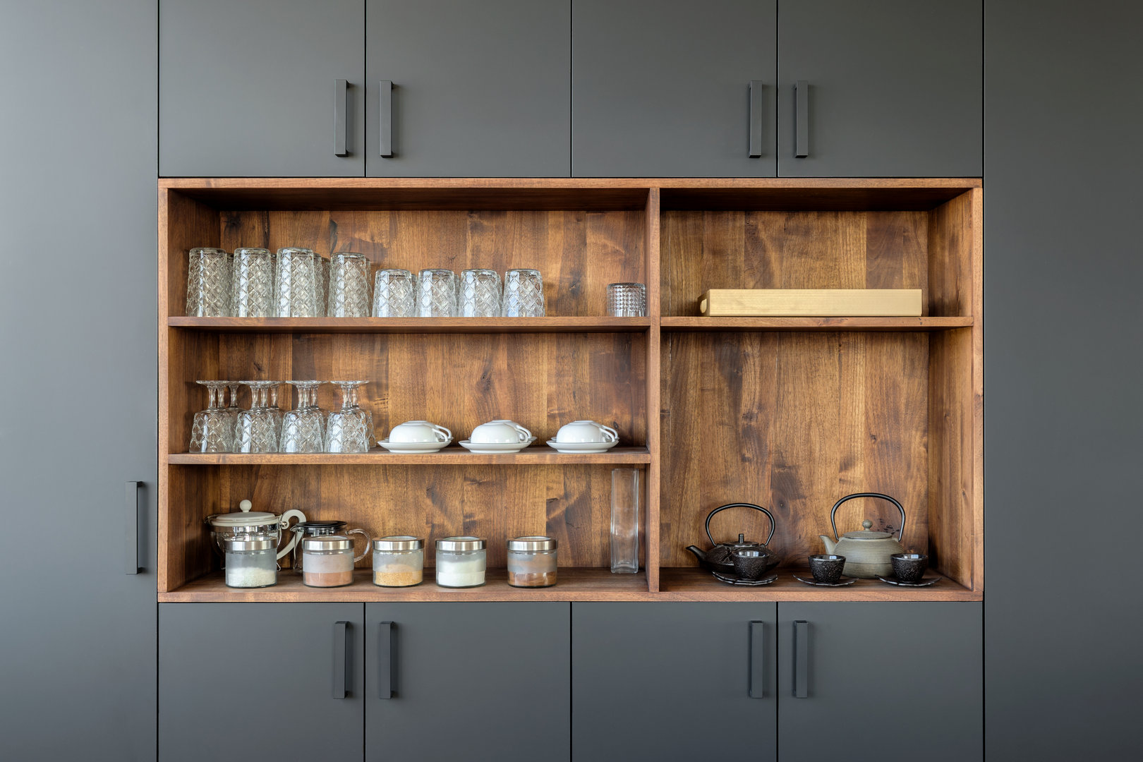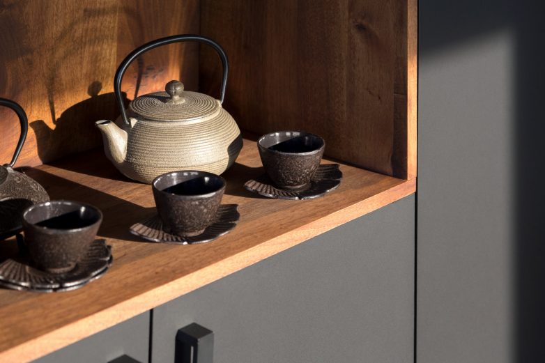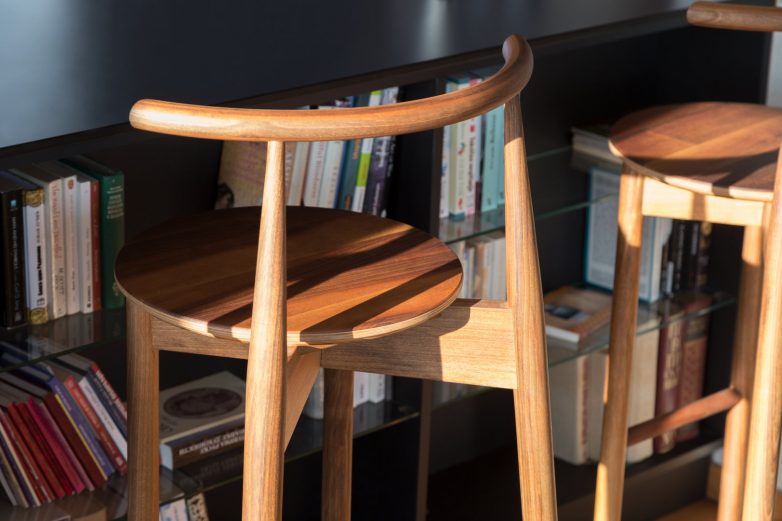 Jedinstven kvalitet enterijera postignut je opremanjem ručno izrađenim nameštajem od oraha i restauriranjem komada iz sredine prošlog veka, u izvedbi beogradskih umetnika Milana Tišme i Uglješe Milanova. Kombinacija prirodnog oraha i sivog mat medijapana daje kuhinji i trpezariji ekskluzivnost i toplinu, a fini elementi nameštaja od oraha u dnevnom boravku stabilnost, ravnotežu i kontinuitet celokupnom centralnom prostoru.