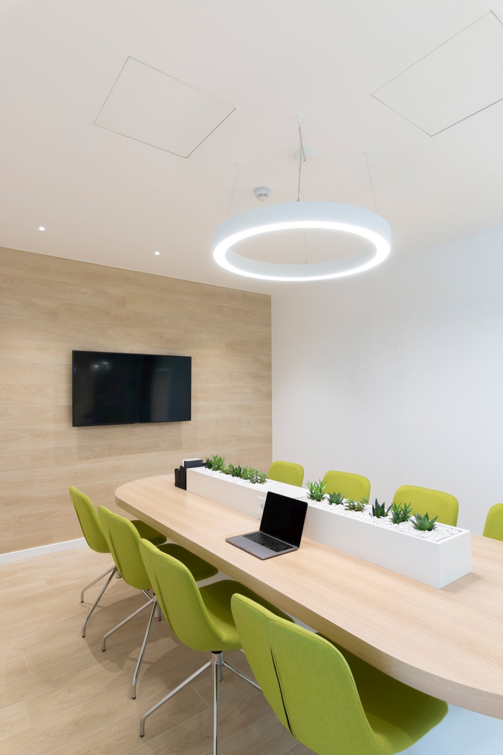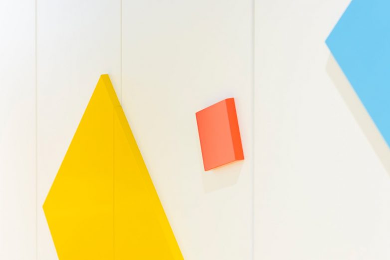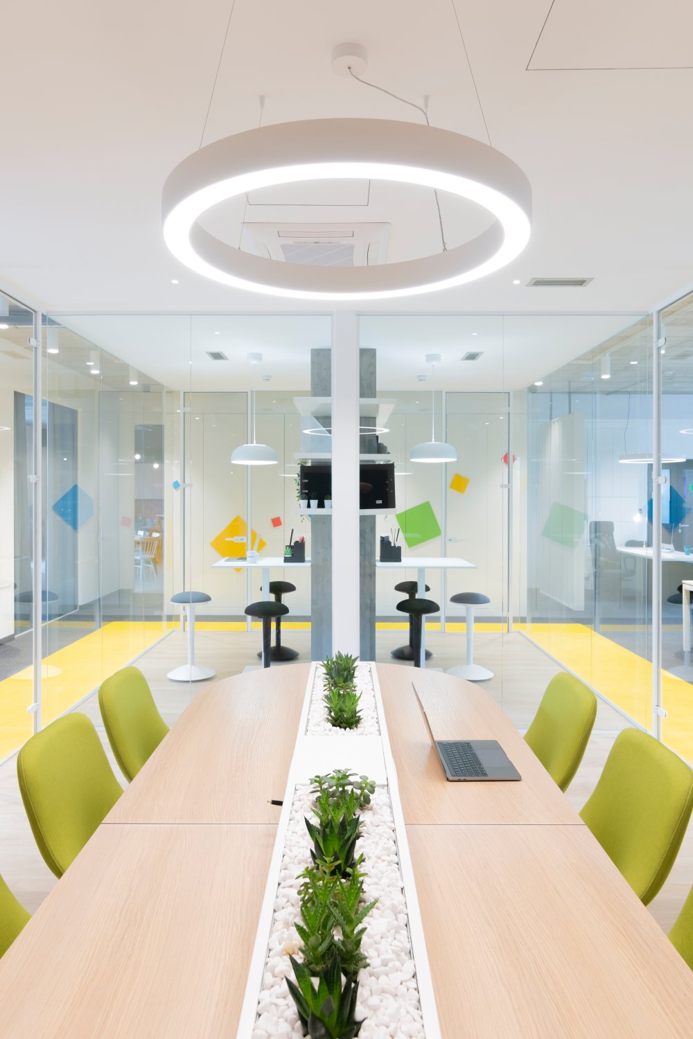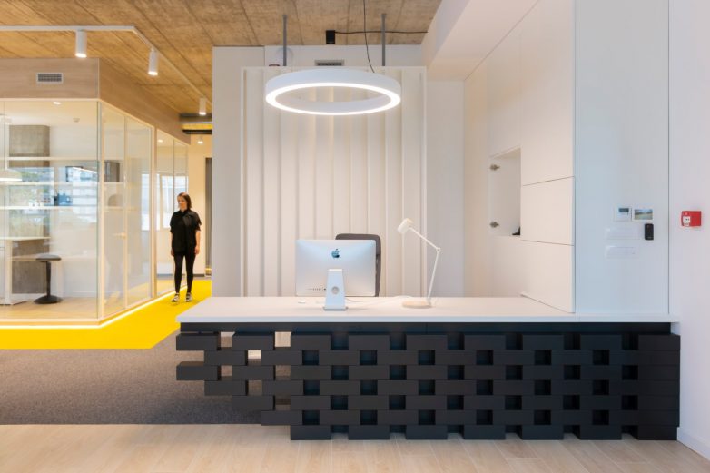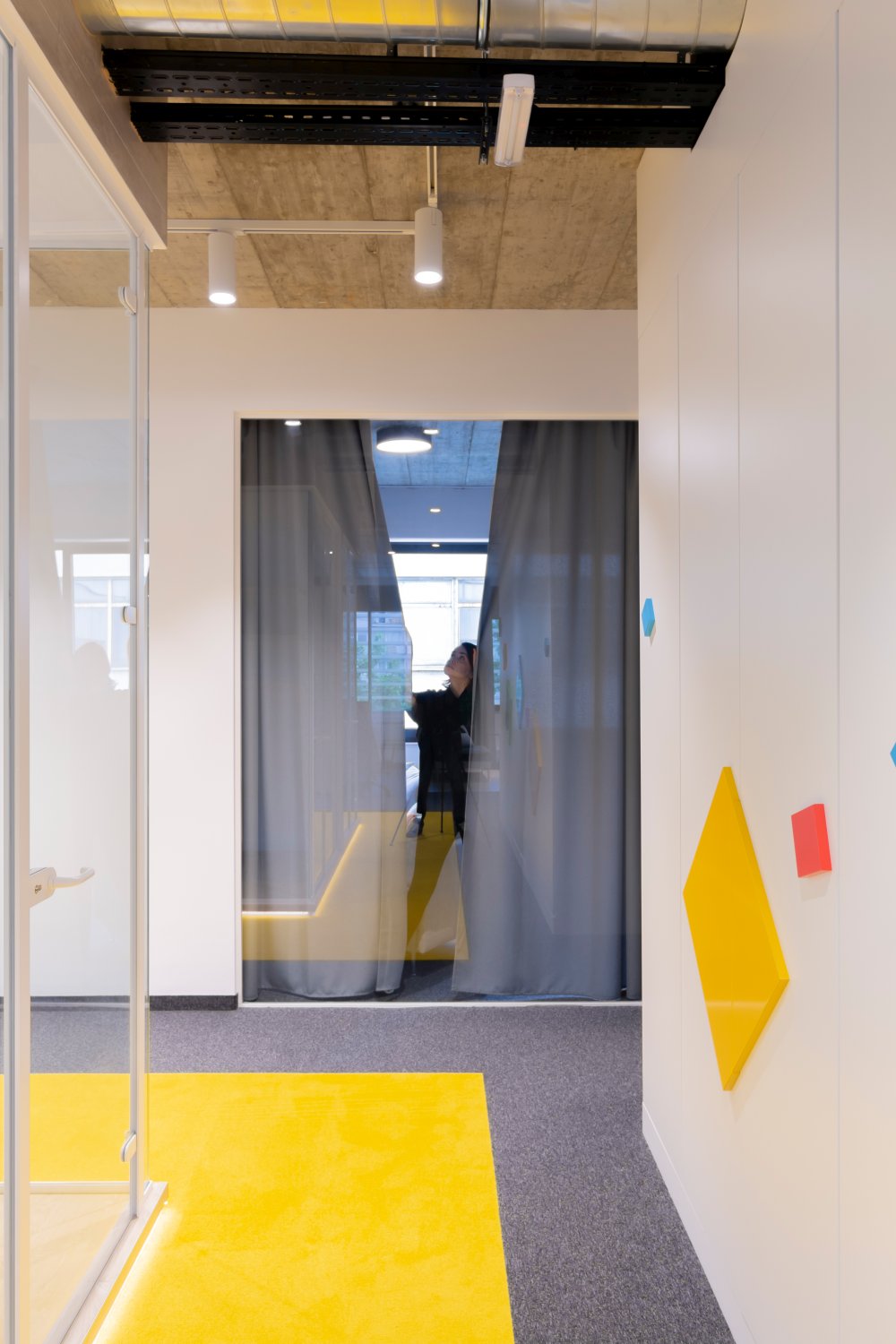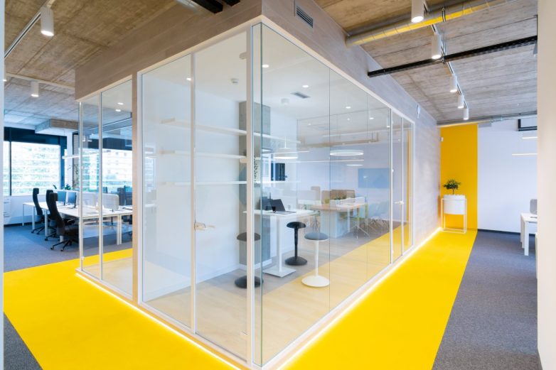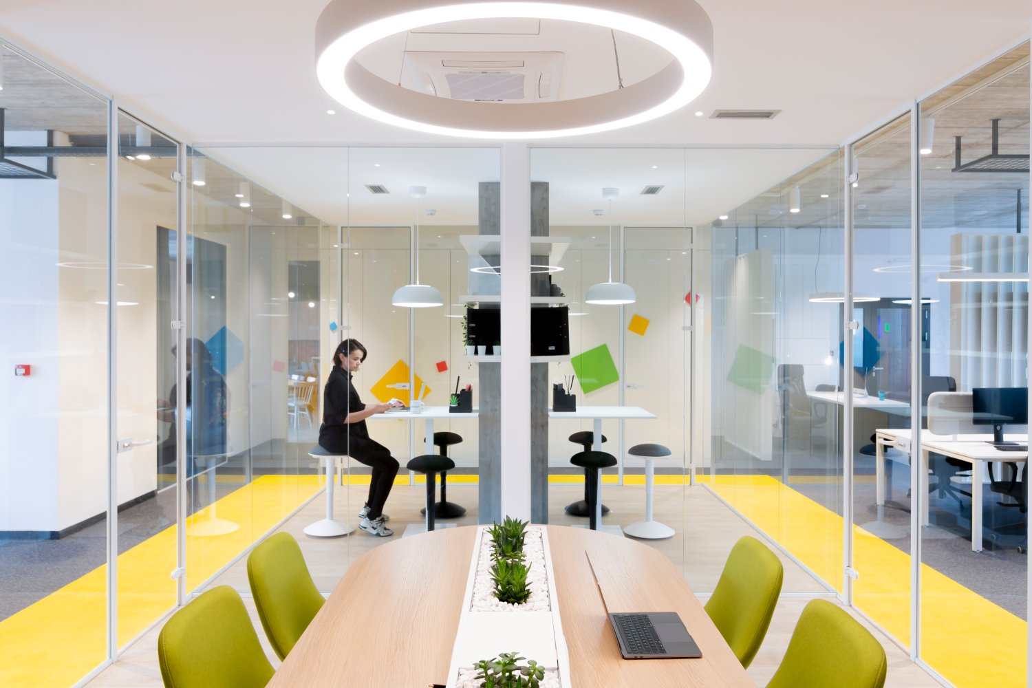 Zidovi su obloženi laminatom u teksturi drveta, pod je izdignut deset centimetara i istaknut LED trakom kako bi izgledao kao da ceo prostor lebdi. Konferencijske sale dodatno su akcentovane žutim itisonima i trakama na zidovima koje uokviruju ovu celinu.