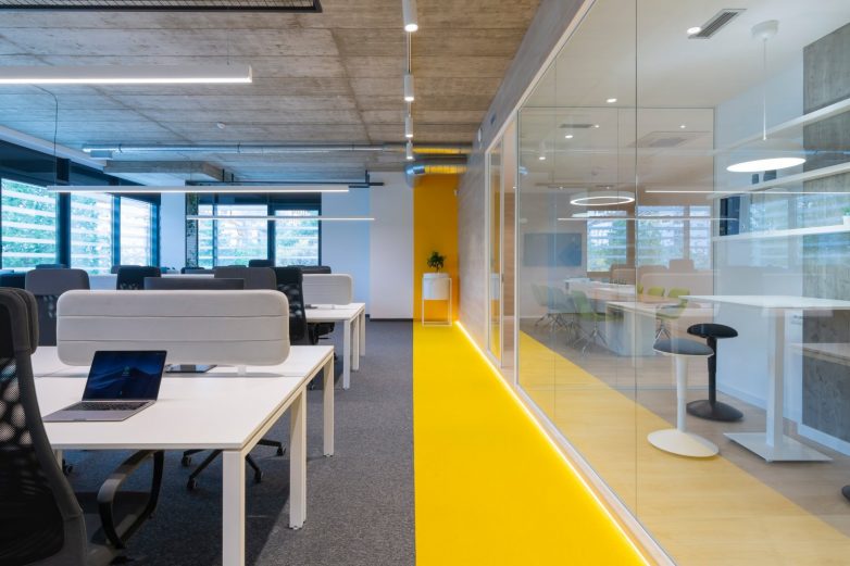U kancelarijskom delu glavna zamisao je bila da se pruži što kvalitetniji prostor za rad. S tim na umu, kreirane su radne jedinice ograđene zvučnim barijerama koje smanjuju nivo buke. Velika pažnja posvećena je kvalitetu rasvete pa je stoga iznad radnih stolova instalirana Random S linijska rasveta kompanije Intra Lighting kao i reflektori Intra Lighting Pipes T bele boje na šini koja ide po obimu kancelarijskih sala. Njima su pridodate Intra Lighting Cub C nadgradni spotovi za dodatno osvetljavanje prostora.