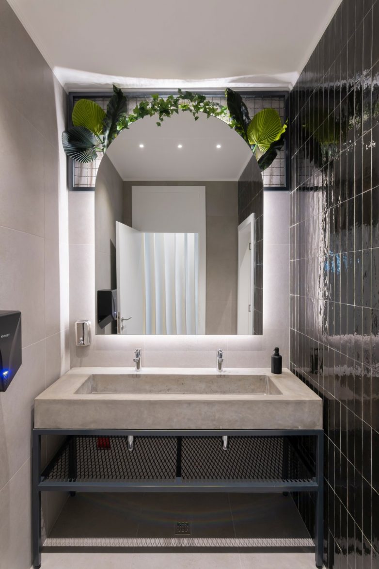 Toaleti su morali ispuniti jedan nesvakidašnji zahtev. Naime, klijenti su u njima želeli atmosferu kao iz modernih kafića. Stoga je korišćena tamnija keramika i velika ogledala koja podižu prostor. Na čeličnu konstrukciju ugrađeni su betonski umivaonici koji su izvedeni po meri, a postavljeno je i zelenilo koje je zaokružilo čitav ambijent.
