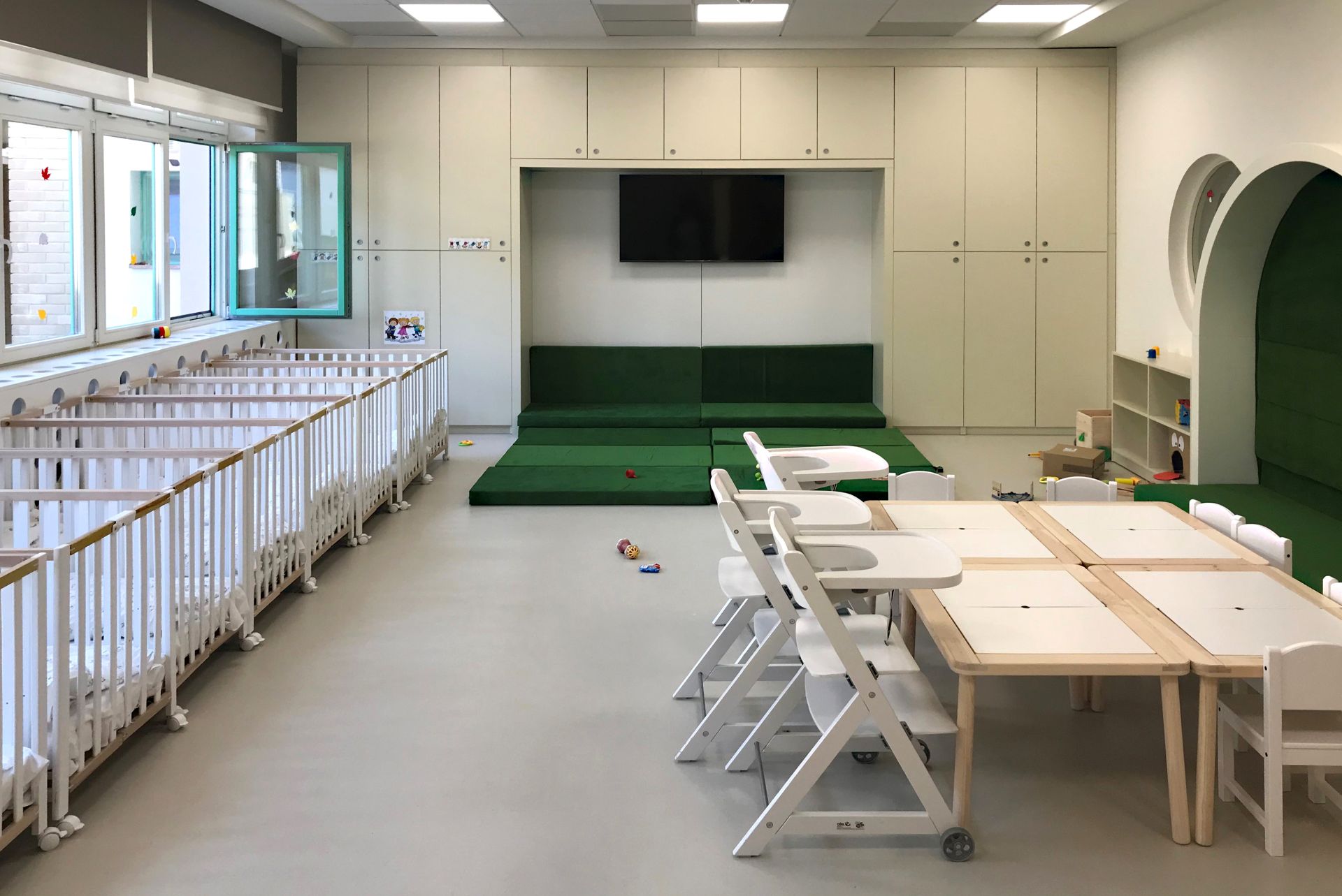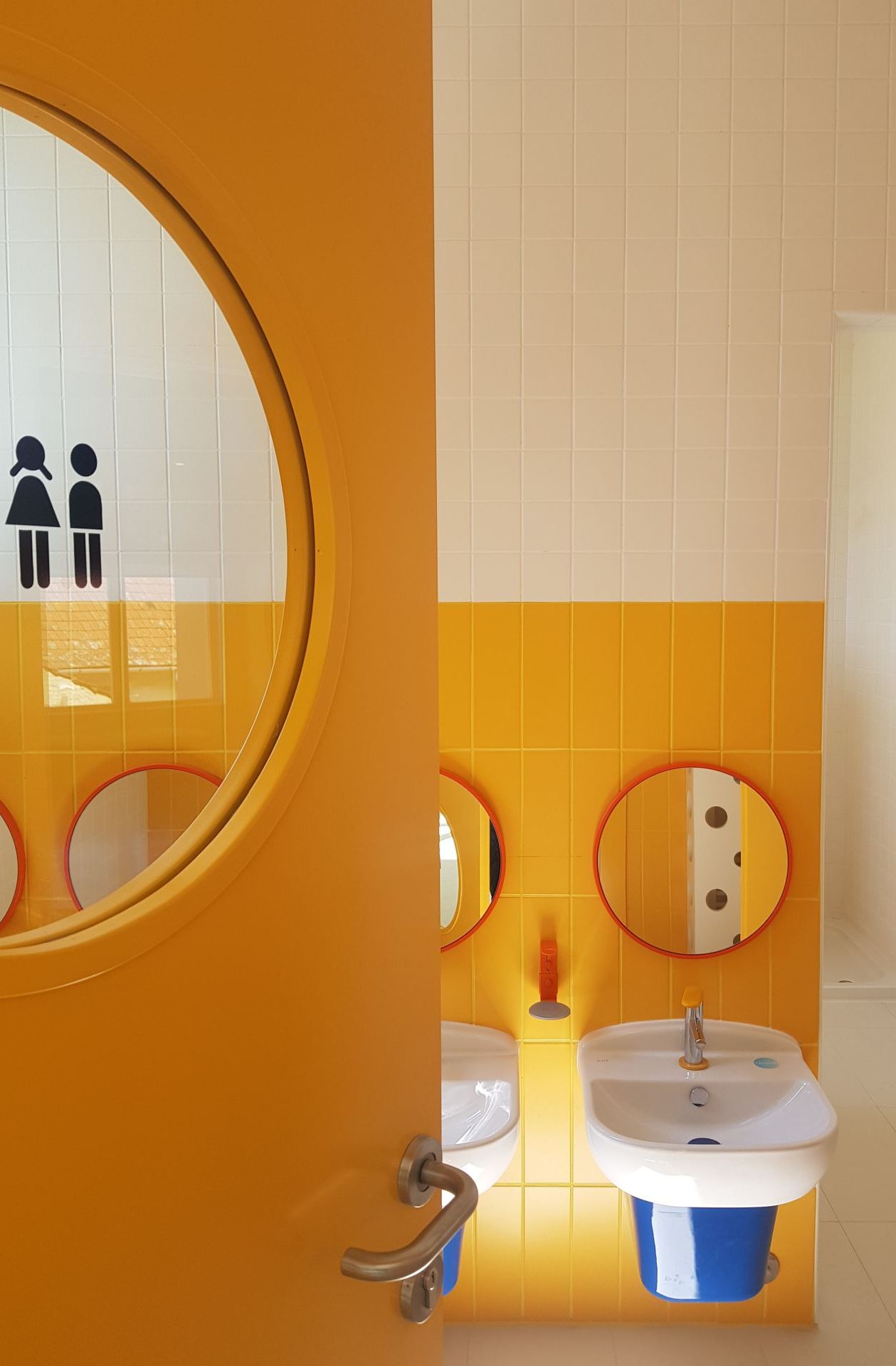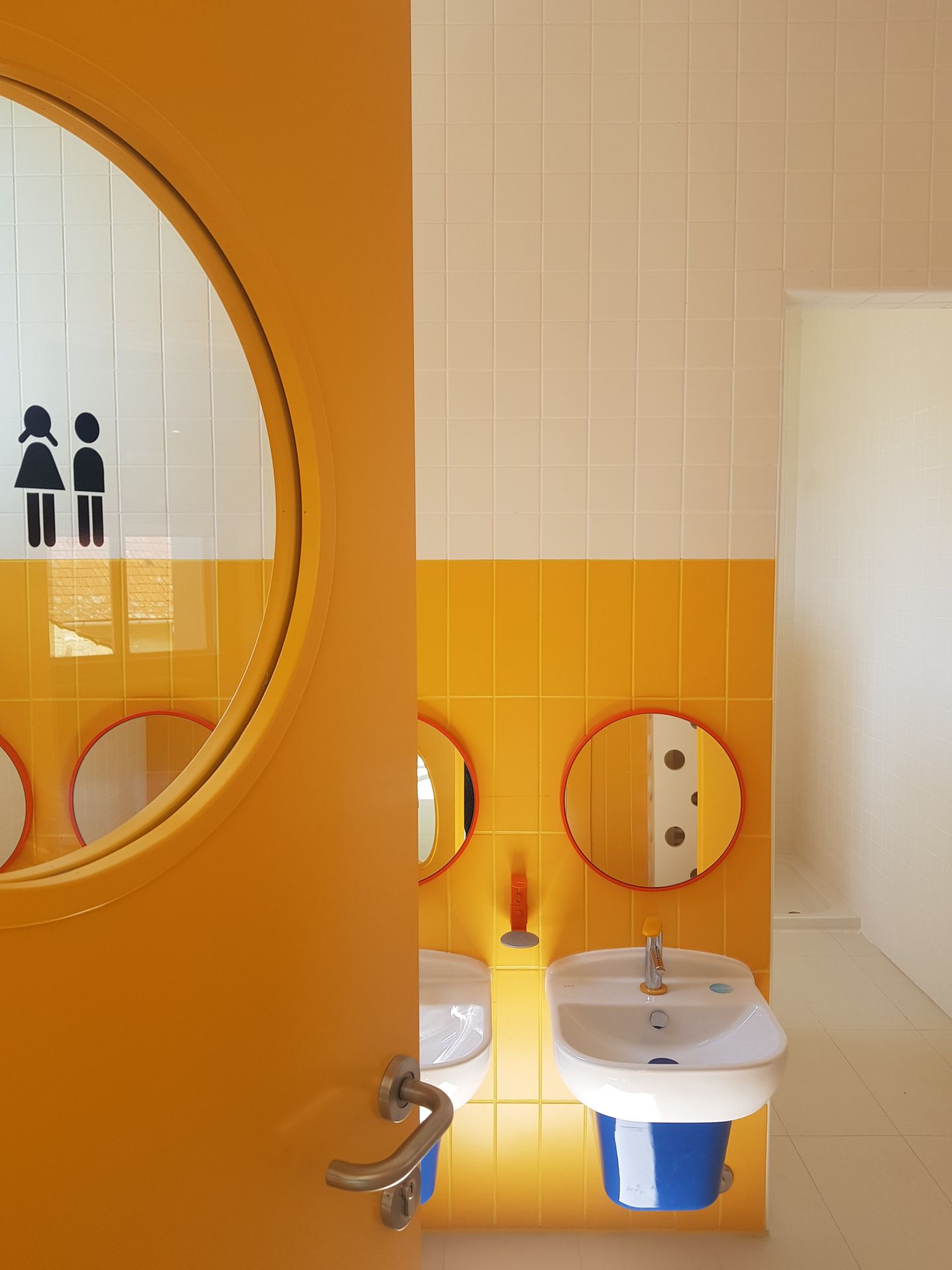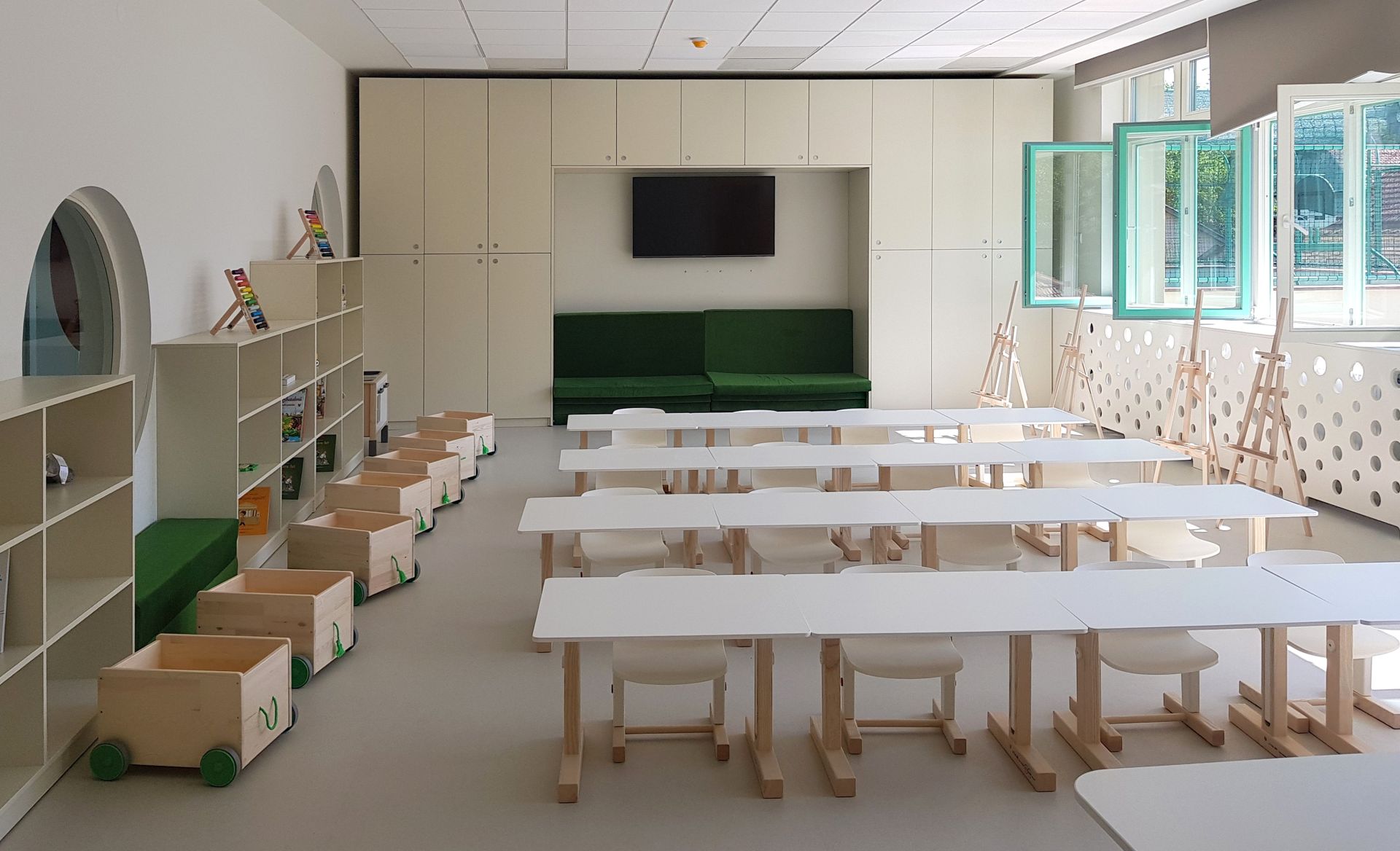 S obzirom da deca obavljaju sve aktivnosti u jednoj sobi sem fizičkog vaspitanja, od prostora se jednostavno zahtevalo da bude neutralan sa naglaskom na lako održive i perive površine.