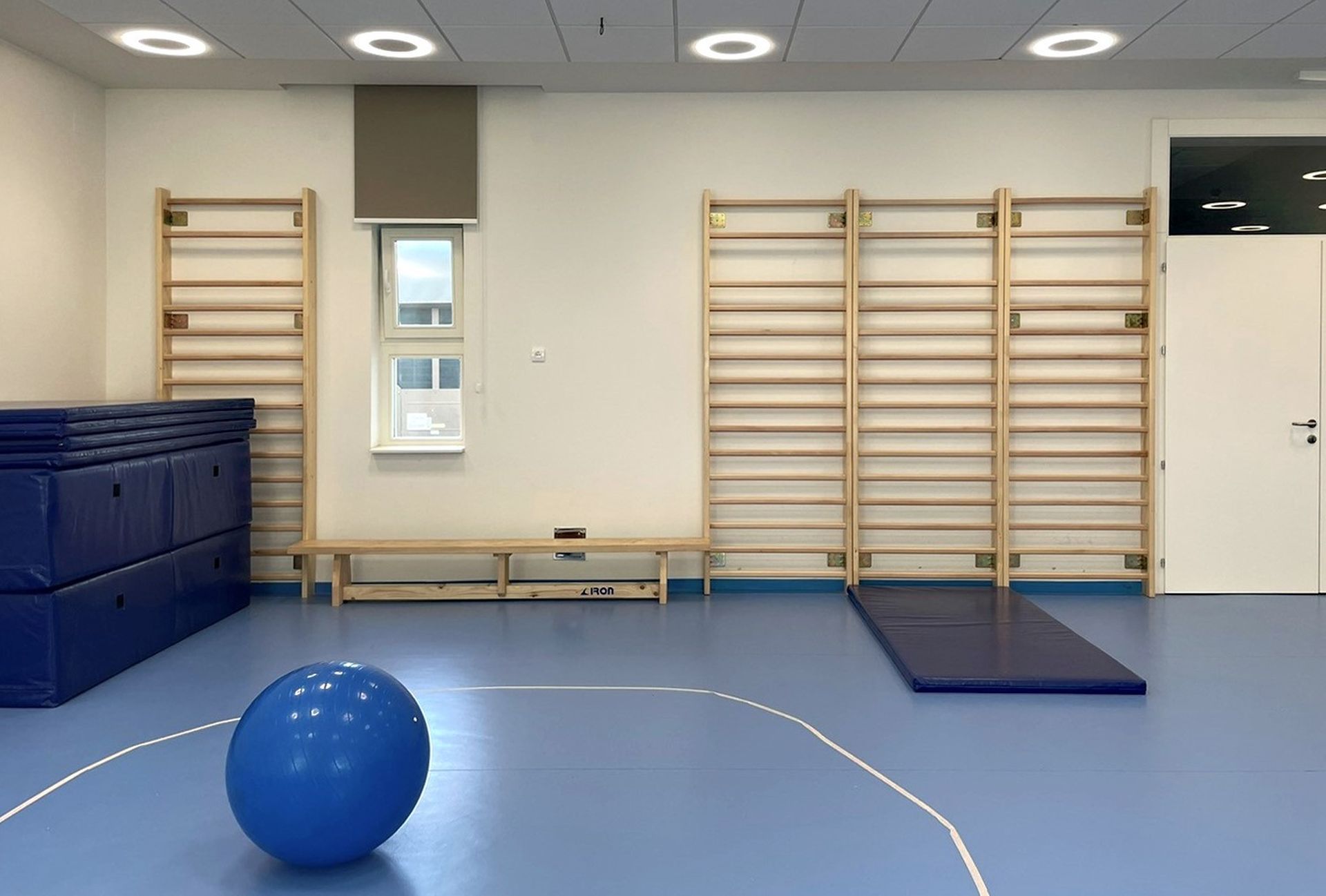 Perforirane maske za radijatore farbane su takođe u beloj boji. Prostor je upotpunjen opremom koja je adekvatna za fiskulturnu salu koja će obezbediti pravilan razvoj dece, kažu na kraju iz Arhitektura dizajn studija.