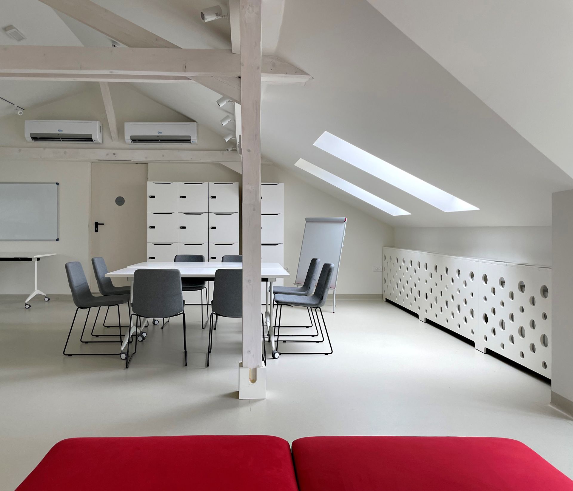 Svi radijatori sakriveni su perforiranim maskama od MDF, farbanim u različitim bojama. Sve maske u sobama farbane su u belu boju dok su u komunikacijama farbane u primarne boje.