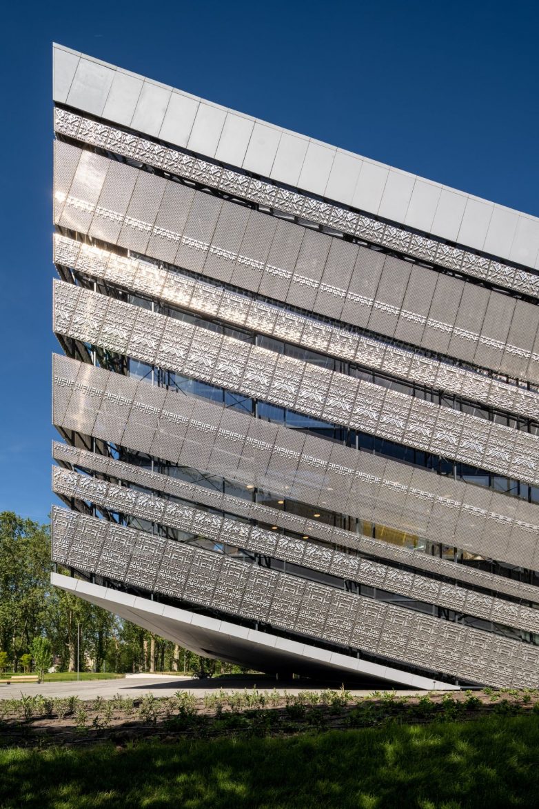 Spektakularni zaštitni znak objekta, osim zakrivljenog zelenog krova, je staklena zavesa koja okružuje uređenu krovnu baštu i koju krasi skoro pola miliona piksela, odnosno rastera napravljenog od metalne mreže zasnovane na etnografskim motivima odabranim iz kolekcije muzeja.