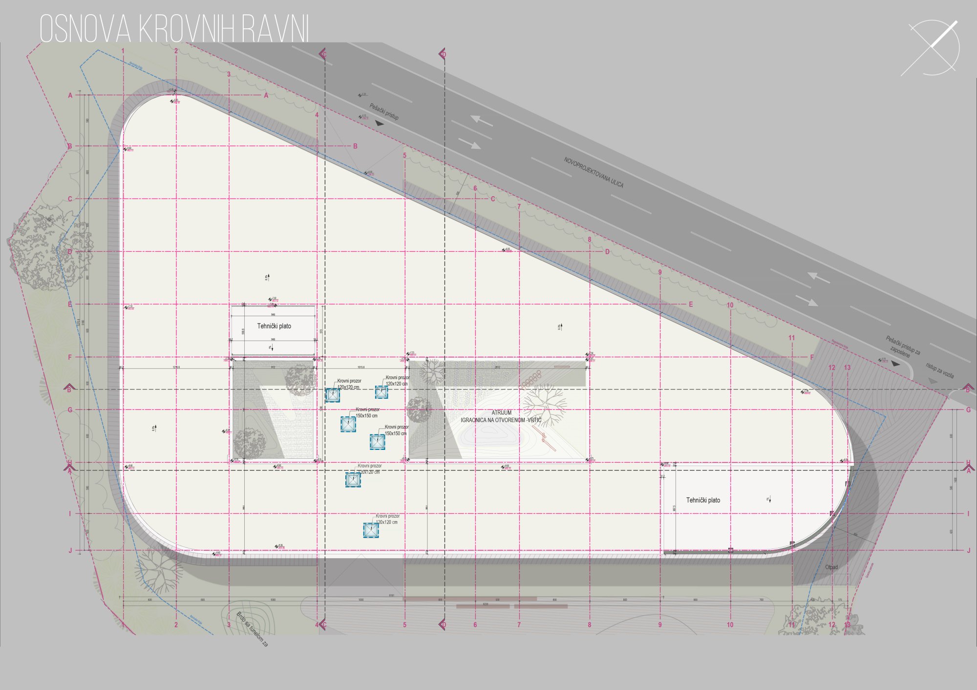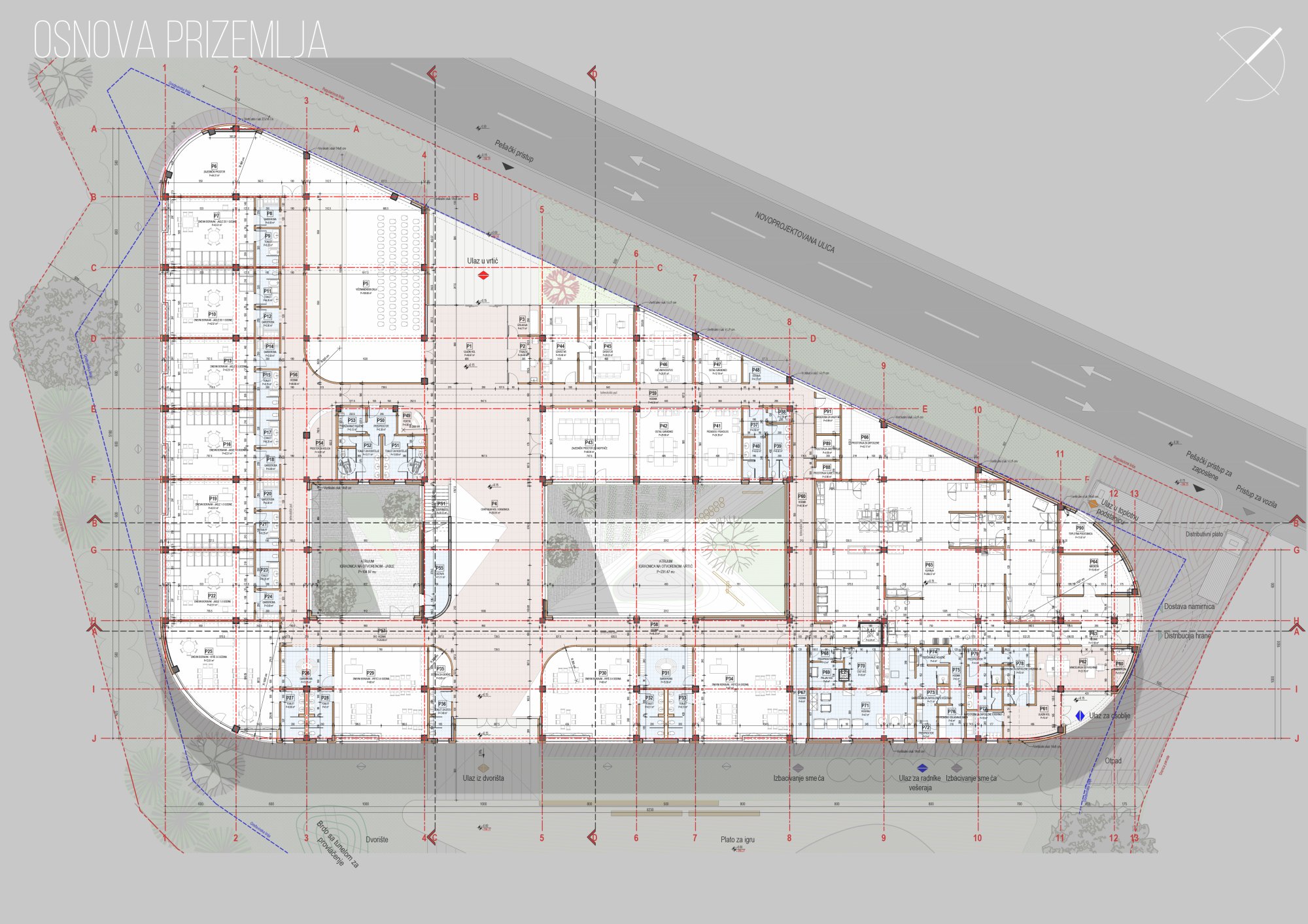 Na pravcu između glavnog ulaza u objekat i pristupa iz dvorišta, prostire se centralni hol sa stepeništem, koji može imati funkciju igraonice. Sa leve i desne strane od centralnog hola nalaze se dva atrijuma – igraonice na otvorenom, koje su opremljene savremenim dečijim mobilijarom. Parter atrijuma je pažljivo osmišljen tako da probudi dečiju maštu i kroz igru poboljša njihovu motoriku. Unutar njih predviđena su veštačka brda sa niskim i visokim zelenilom, kao i vijugave staze od behaton ploča.