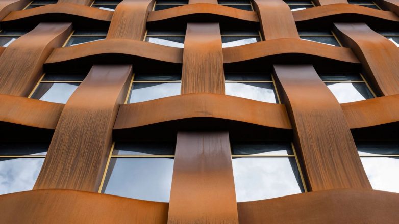 Talasaste ploče od čelika sirovog izgleda obmotavaju zgradu sa sve četiri strane, formirajući mrežu nalik pletenoj korpi.