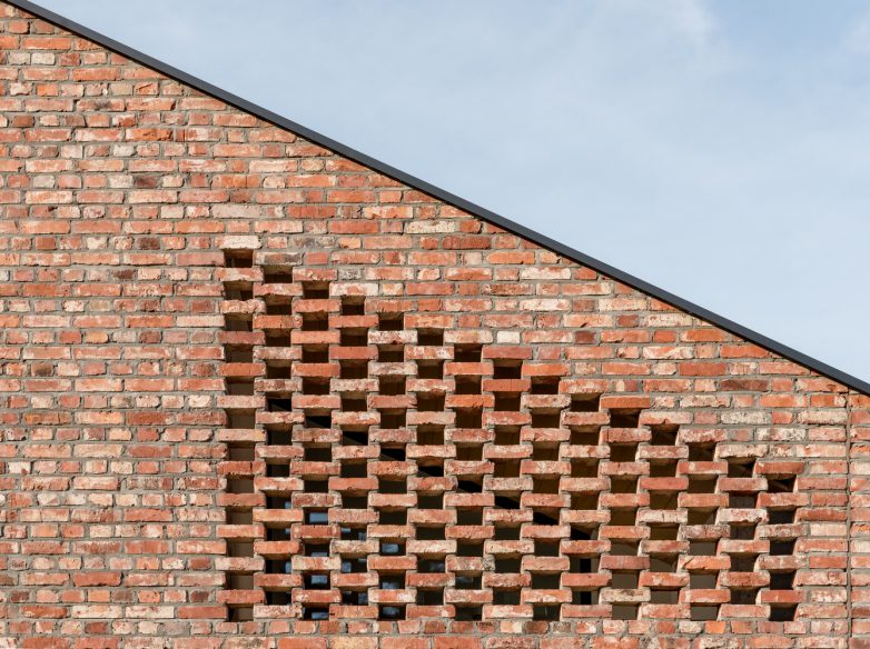 Fasada se sastoji od četiri vrste opečnih veza sa različitim nivoima oblikovanja i transparentnosti.