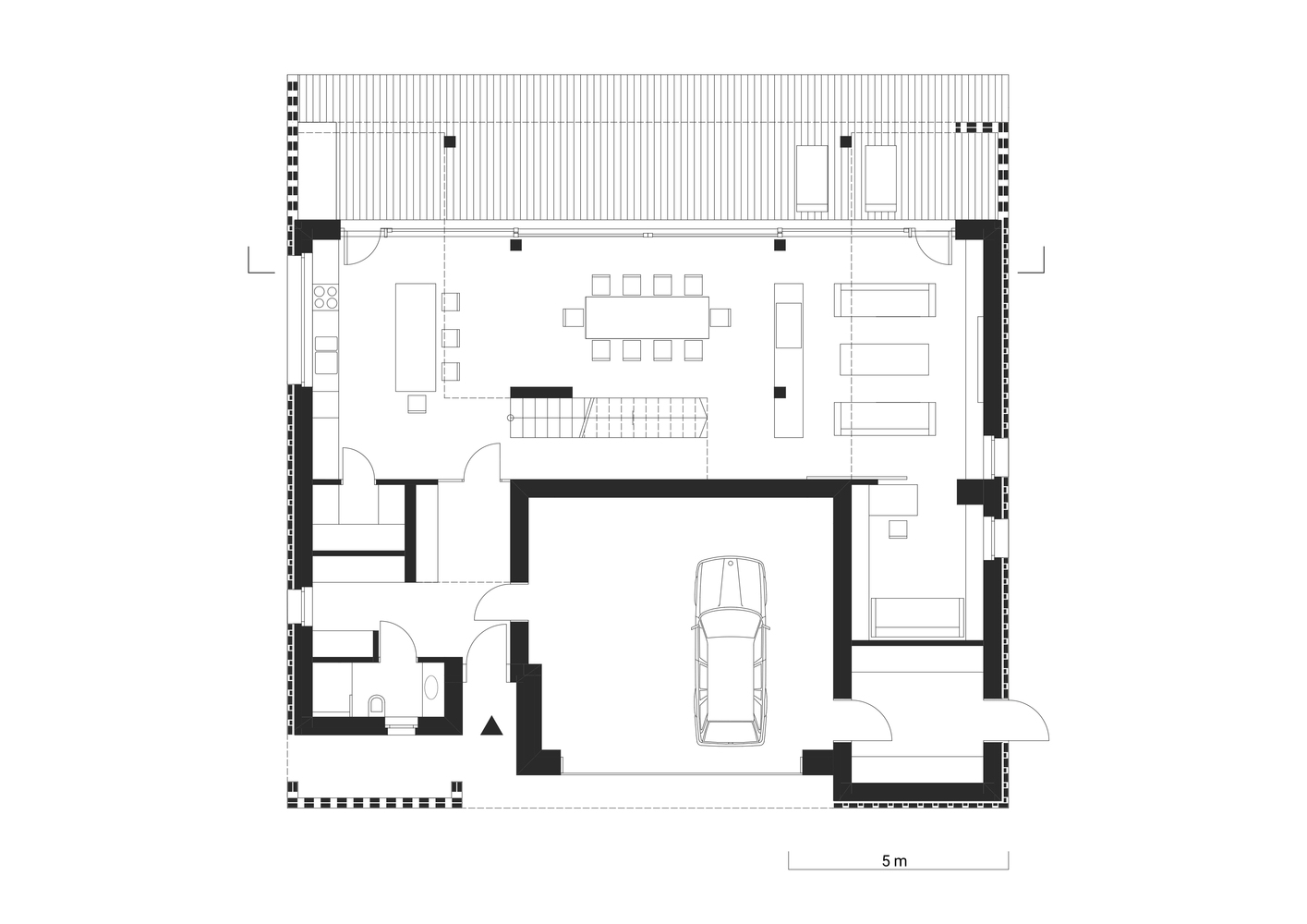 Iako se možda čini kao neuobičajeno rešenje da se garaža postavi u sredinu kuće, arhitekti objašnjavaju da je na taj način direktno povezana garaža sa ulaznim hodnikom, vešernicom, kotlarnicom i ostavom. Iznad garaže se nalaze dečije sobe i dodatno potkrovlje.