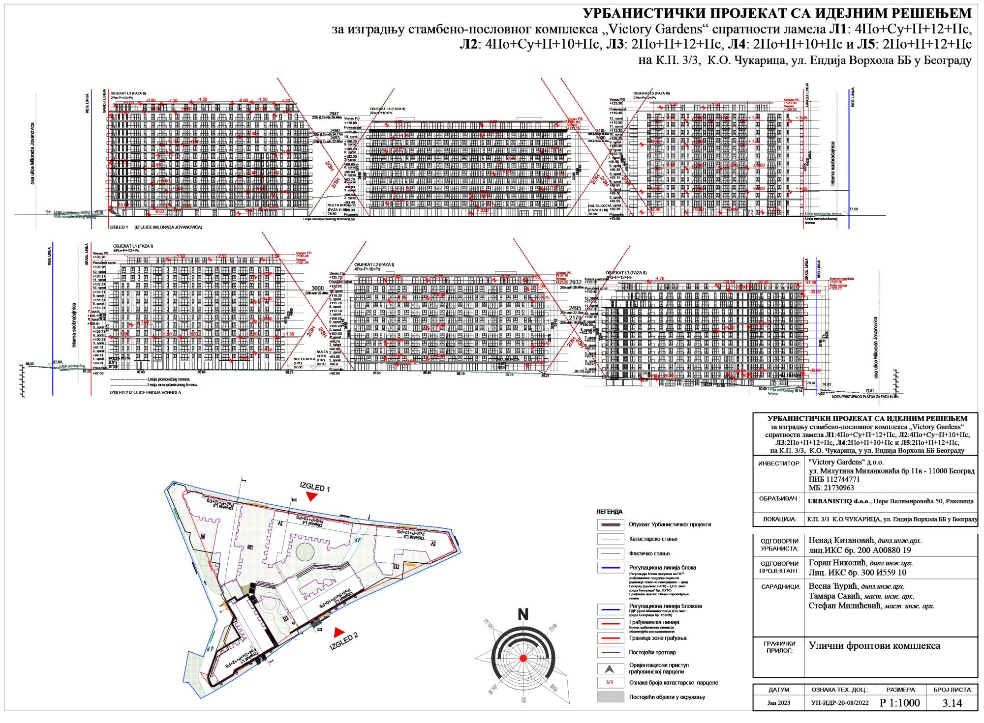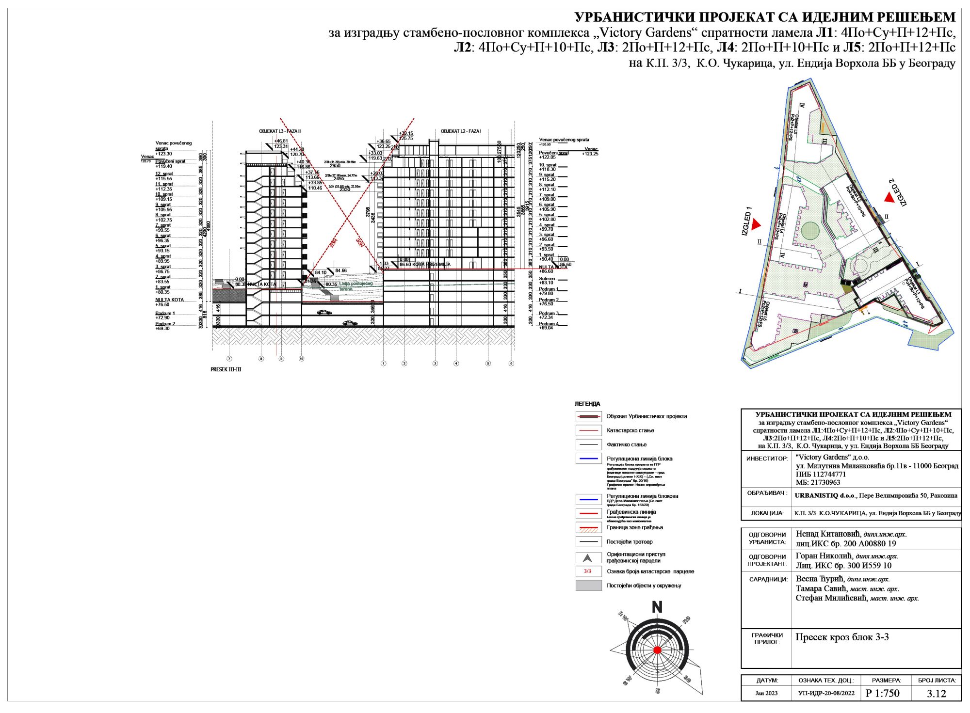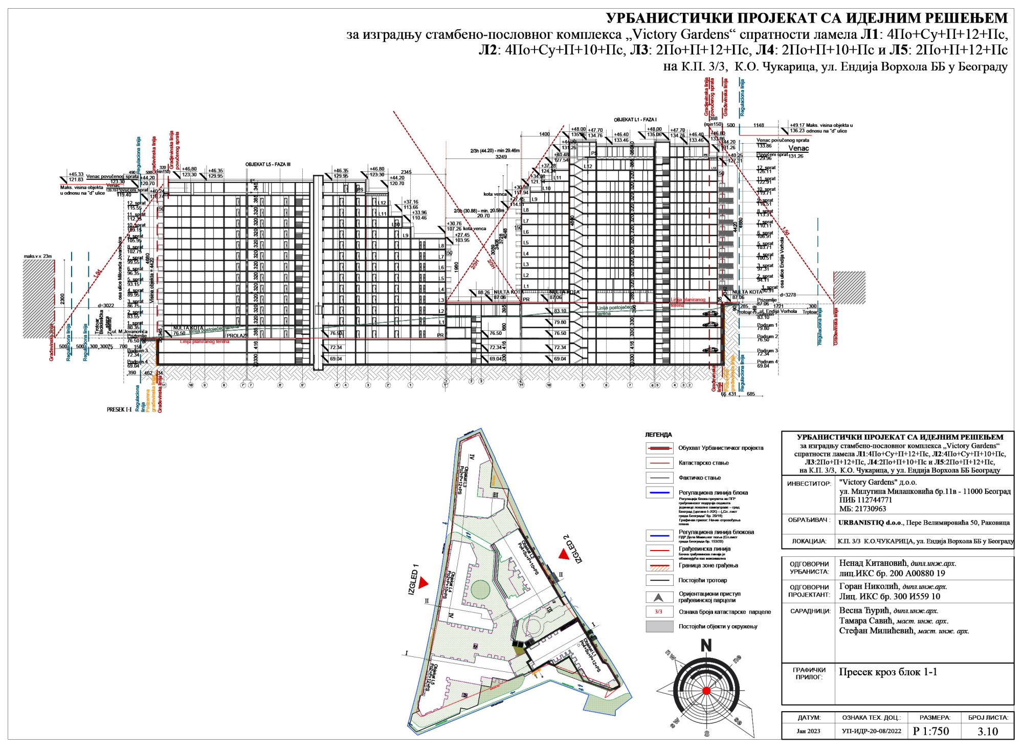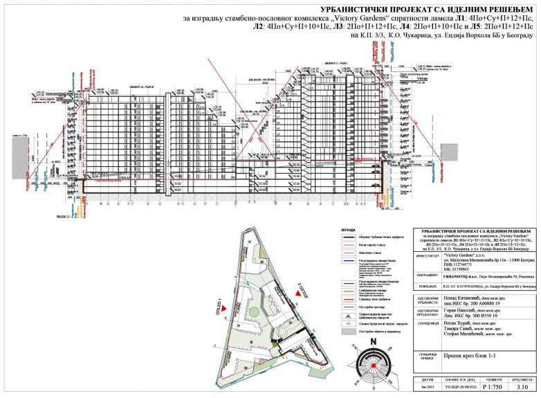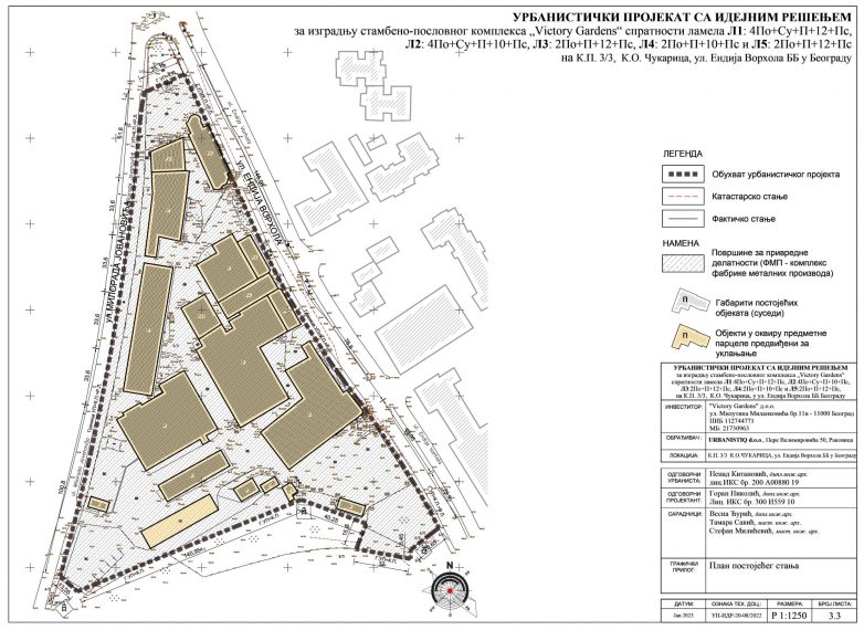 Nosilac izrade projekta je društvo za arhitekturu, urbanizam i inženjering „Urbanistiq” d.o.o. iz Rakovice, koje je zahtev za potvrđivanje podnelo u ime investitora „Victory Gardens” d.o.o. iz Beograda. Odgovorni urbanista je Nenad Kitanović, dia, a odgovorni projektant Goran Nikolić, dia.