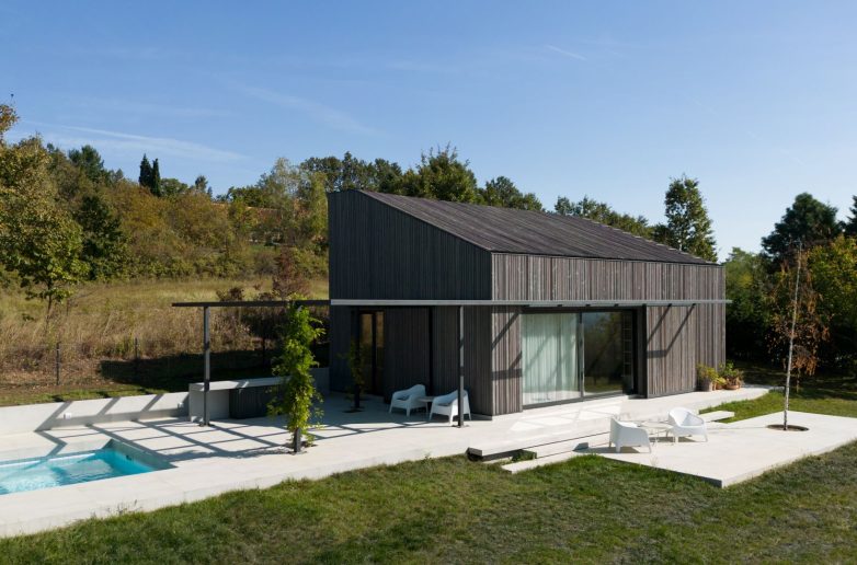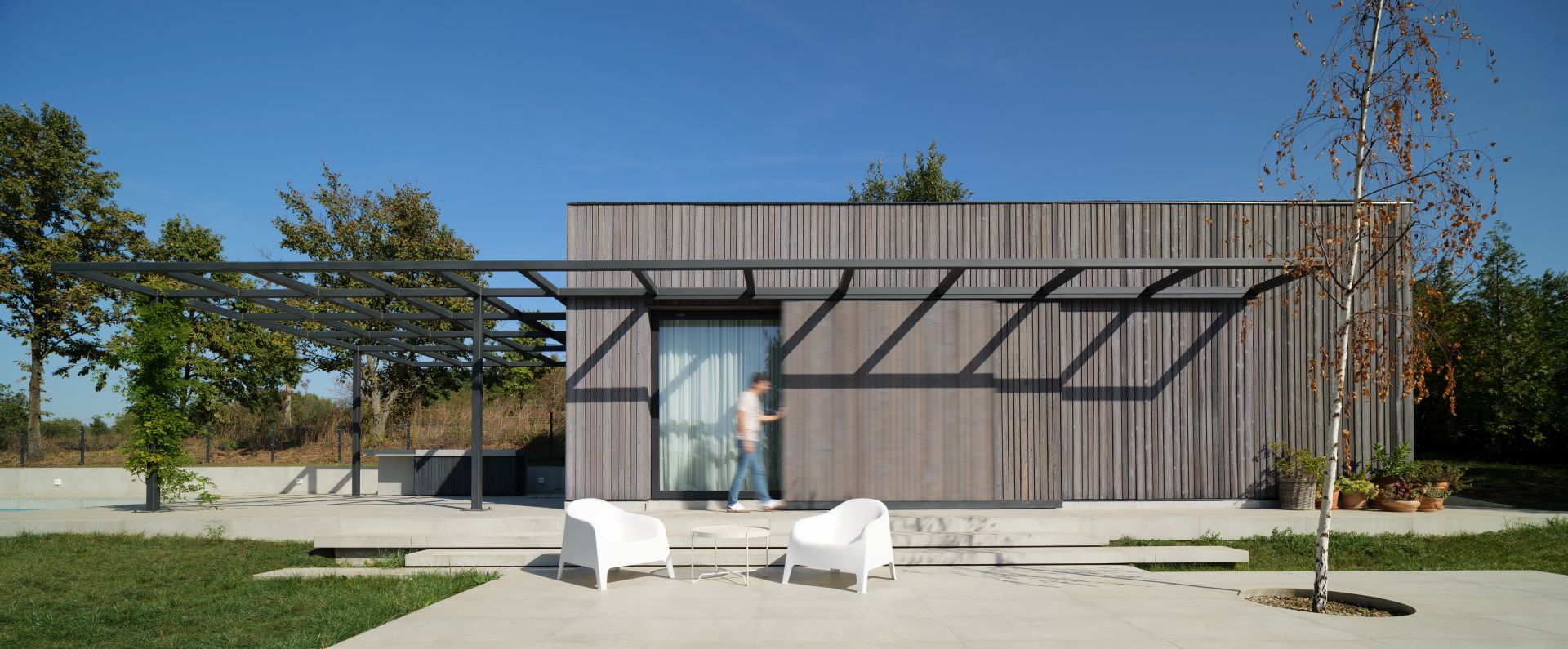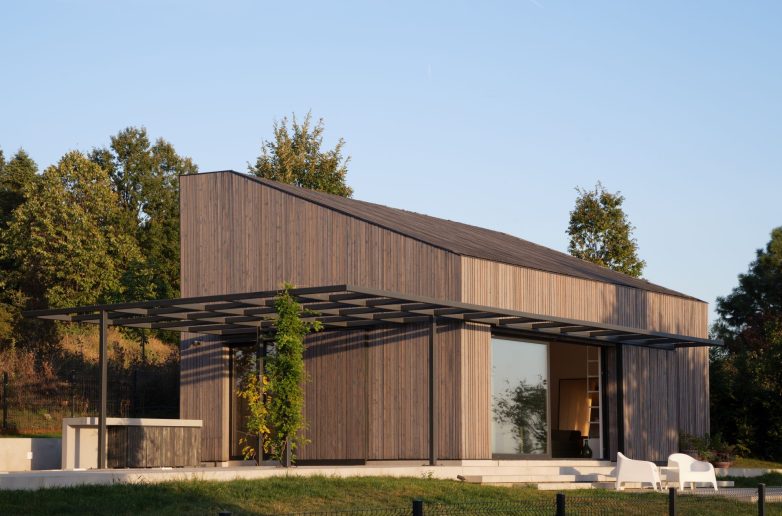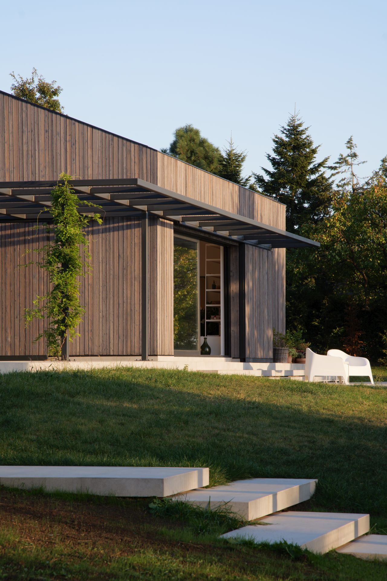 „Spoljašni omotač kuće je od prve ideje planiran da bude jednoobrazan, kako na fasadi, tako i na krovu. Izbor je pao na termotretirani ariš, ali tretiran starom japanskom tehnikom paljenja drveta. Ovom tehnikom drvo dobija dugogodišnju otpornost na vremenske uslove, a istovremeno je postignuta i željena ujednačena boja patine, što nam je delovalo kao najadekvatniji izbor“ – kaže autorka.
