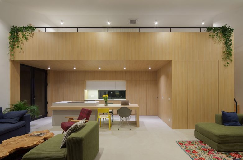 S obzirom da je prizemni nivo kompletno otvoren boravišni prostor sa kuhinjom koji korespondira sa dvorištem i tremom, a spavaći blok je sakriven na galeriji, stepenište koje vodi na galeriju je takođe sakriveno u “procepu” između unutrašnje drvene i spoljašnje fasadne envelope, navodi Lazović.