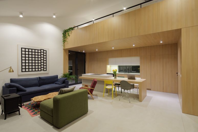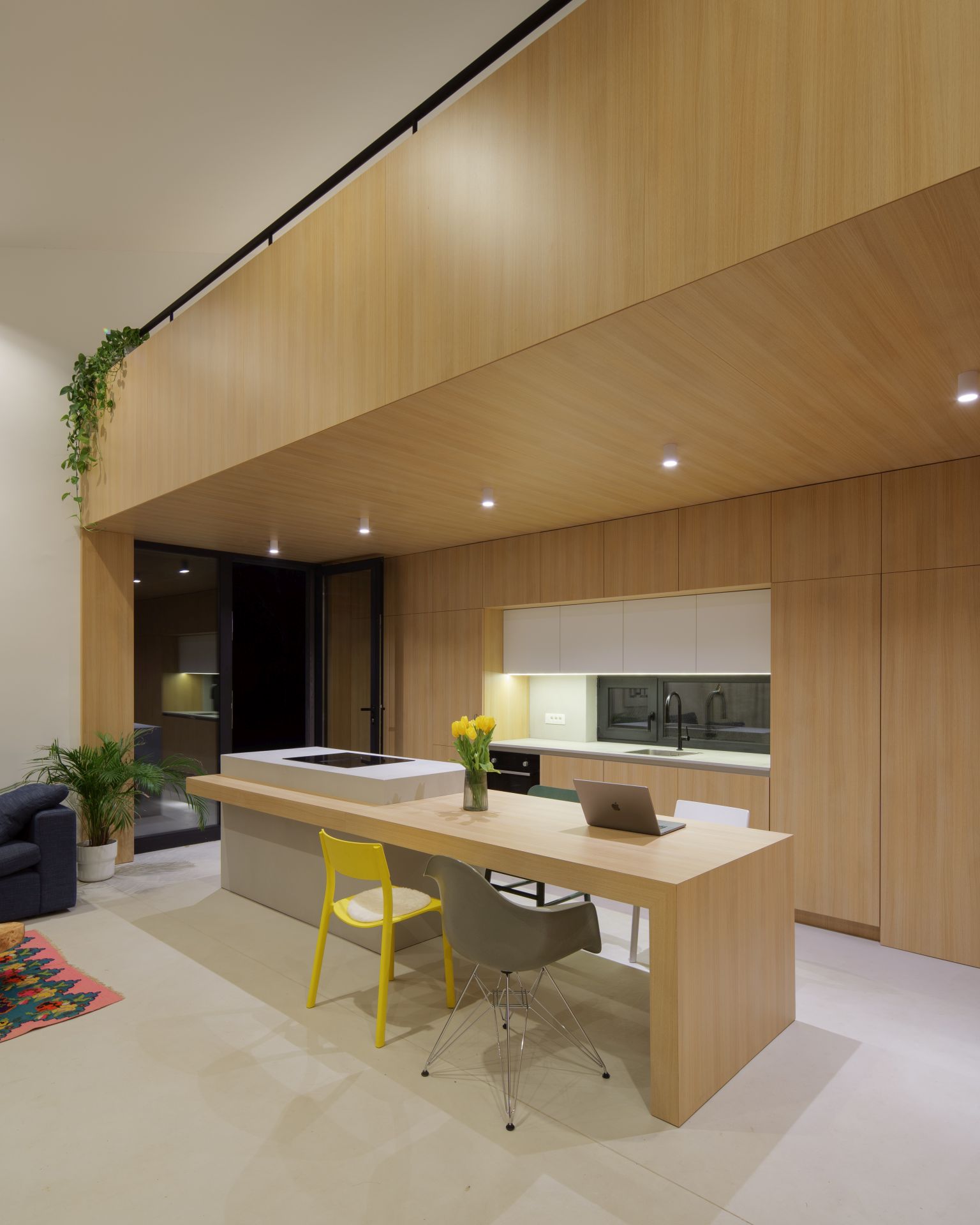 Kad je reč o unutrašnjosti objekta, umetnuta kompozicija od drveta u unutrašnji beli fasadni omotač je ključni element enterijera. Pult sa trpezarijom je njegov integrativni deo i centralni motiv kuće oko koga se odvija zivot.