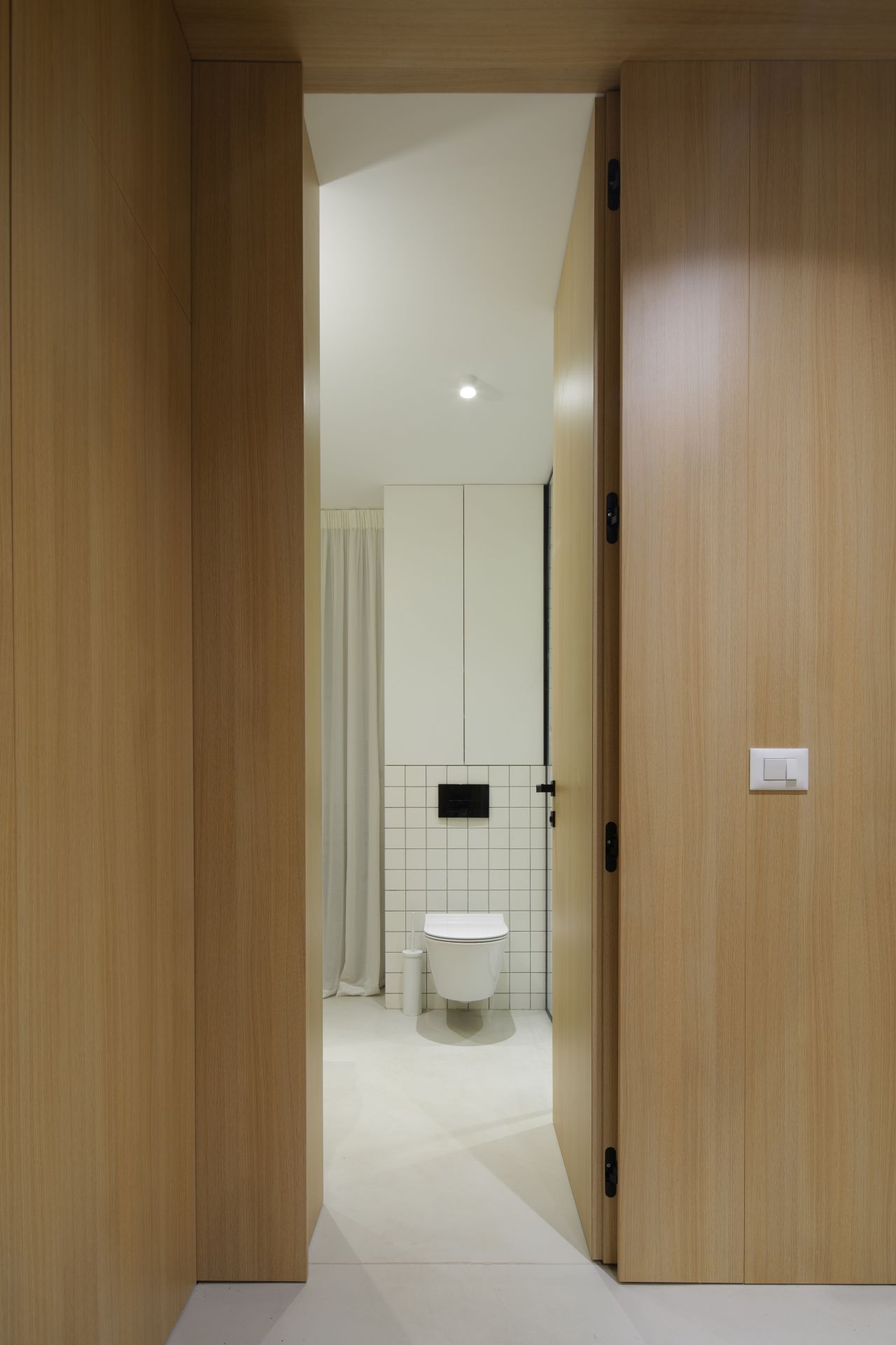 „Na samom ulazu, objedinjeno sa kompozicijom kuhinje, prvo se nalaze ulazni plakari, zatim ugradni delovi kuhinje, pa nakon kuhinjskih elemenata, opet ugradni plakari sve objedinjeno jednom kompaktnom drvenom kompozicijom do zida sa vratima za kupatilo, koja su takođe utopljena u drveni omotač“ – objašnjava autorka.