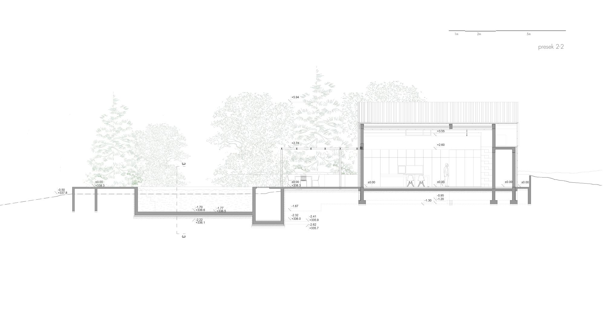U funkcionalnom smislu, pozicija kuhinje, kupatila i ostave, okrenute ka brdu, se takođe oslanja na koncepciju tradicionalne kuće, dok su dnevni boravak, sedenje uz biblioteku i trpezarija okrenuti ka padini i pogledu. Krov na jednu vodu omogućava noćnu zonu na galeriji, ali ne klasičnu, već integrisanu u volumen čitavog prostora, bez fizičkih ograničenja.