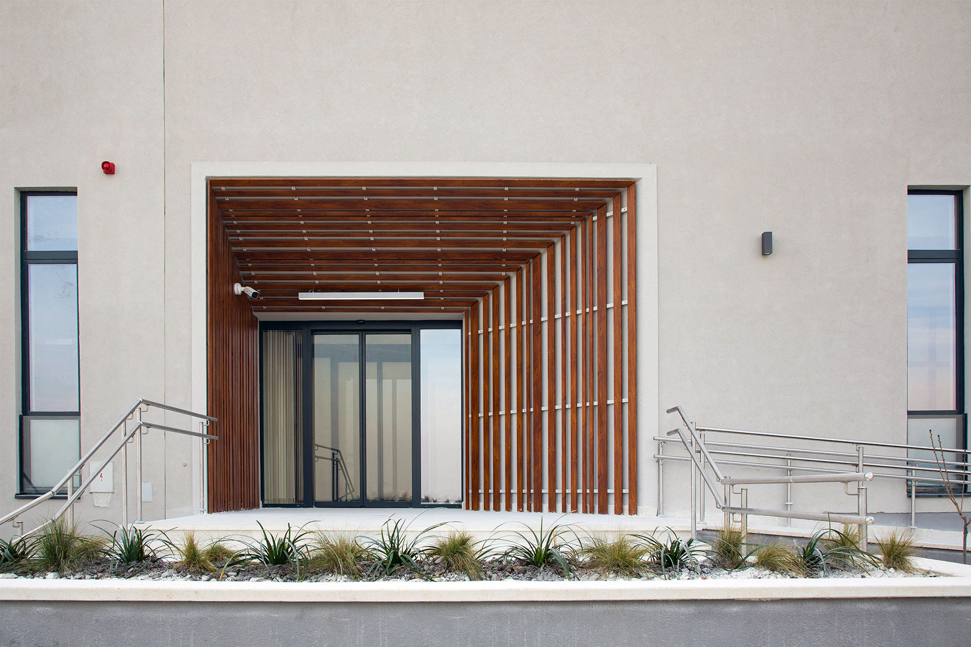 Sa iste strane smeštena su dva ulaza – jedan vodi direktno u smeštajni blok, dok je drugi ulaz administracije, kao i pristup višefunkcionalnoj sali u prizemlju, namenjenoj domu za stare i korisnicima dnevnog centra.