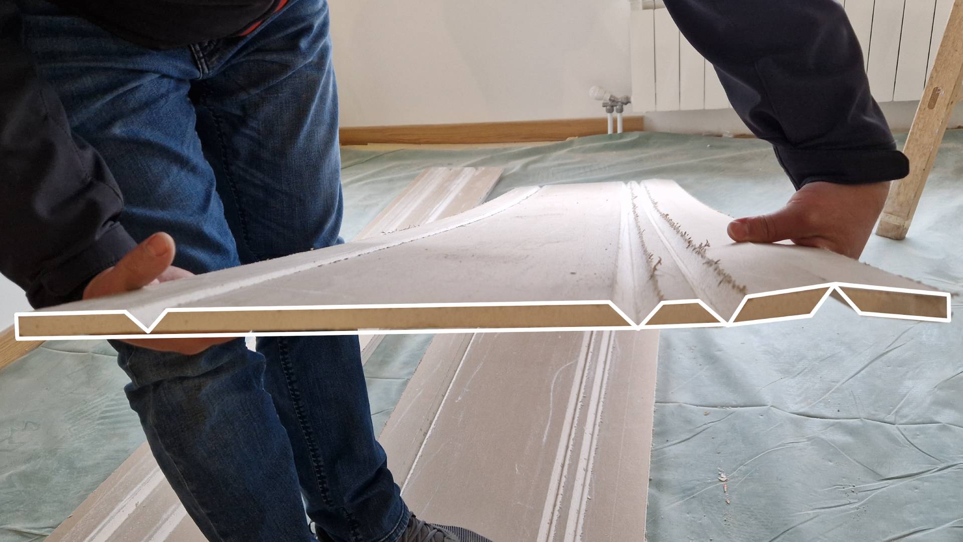 Nakon što se gipsana ploča iseče glodalicom i savije u željeni oblik, kanali se namažu podlogom i zapune se pur penom. Nakon toga se kače na konstrukciju plafona.
