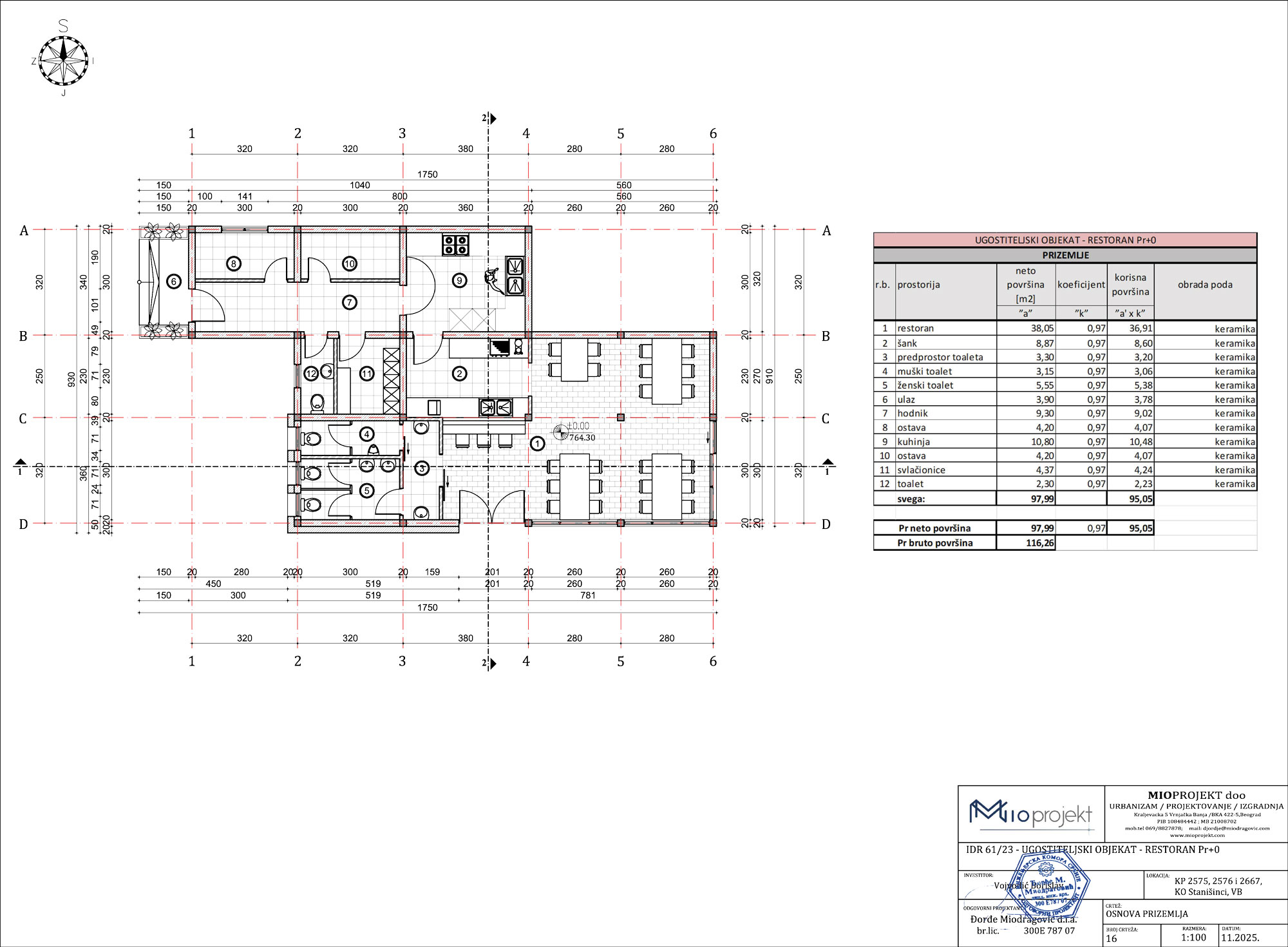Bruto površina ugostiteljskog objekta iznosi 116,26 m², a u njemu se nalaze restoran, šank, ulaz, hodnik, ostave, kuhinja, svlačionice i toaleti.