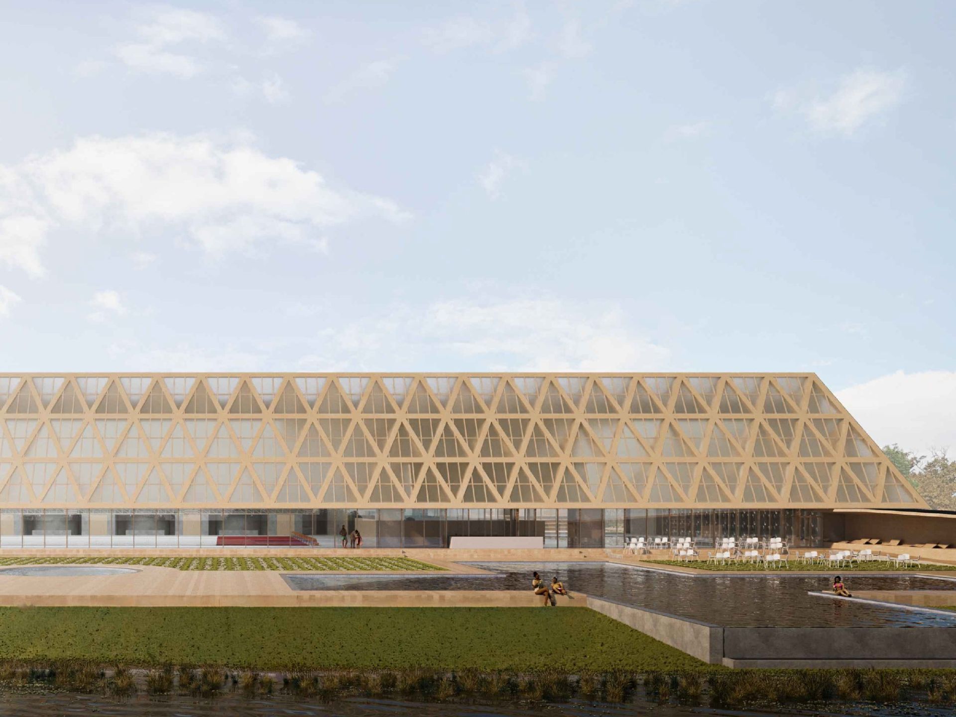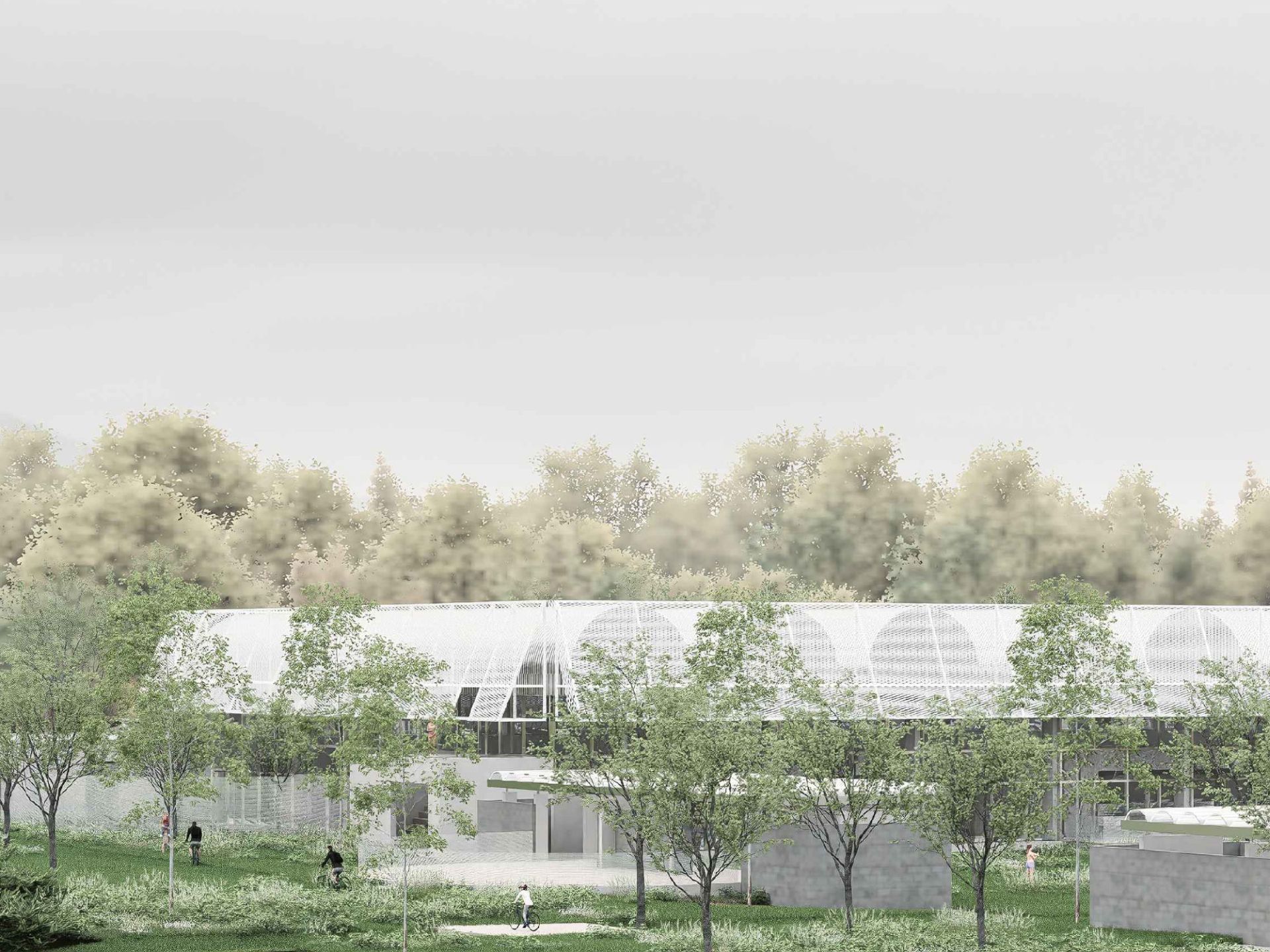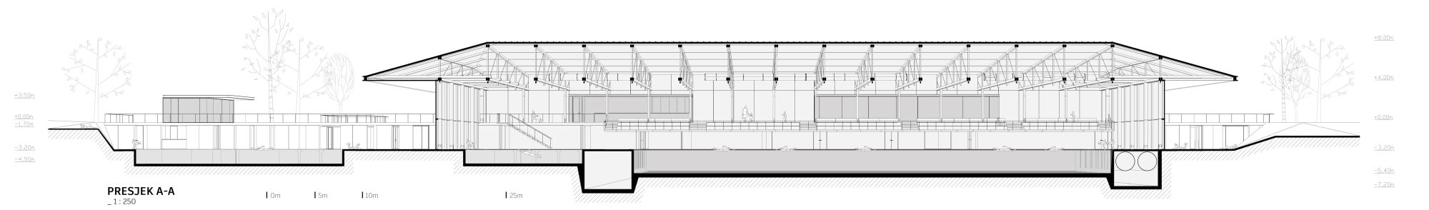 Pobedničko rešenje formira sportski centar kao jedinstvenu topografsku celinu, natkrivenu velikim drvenim krovom.