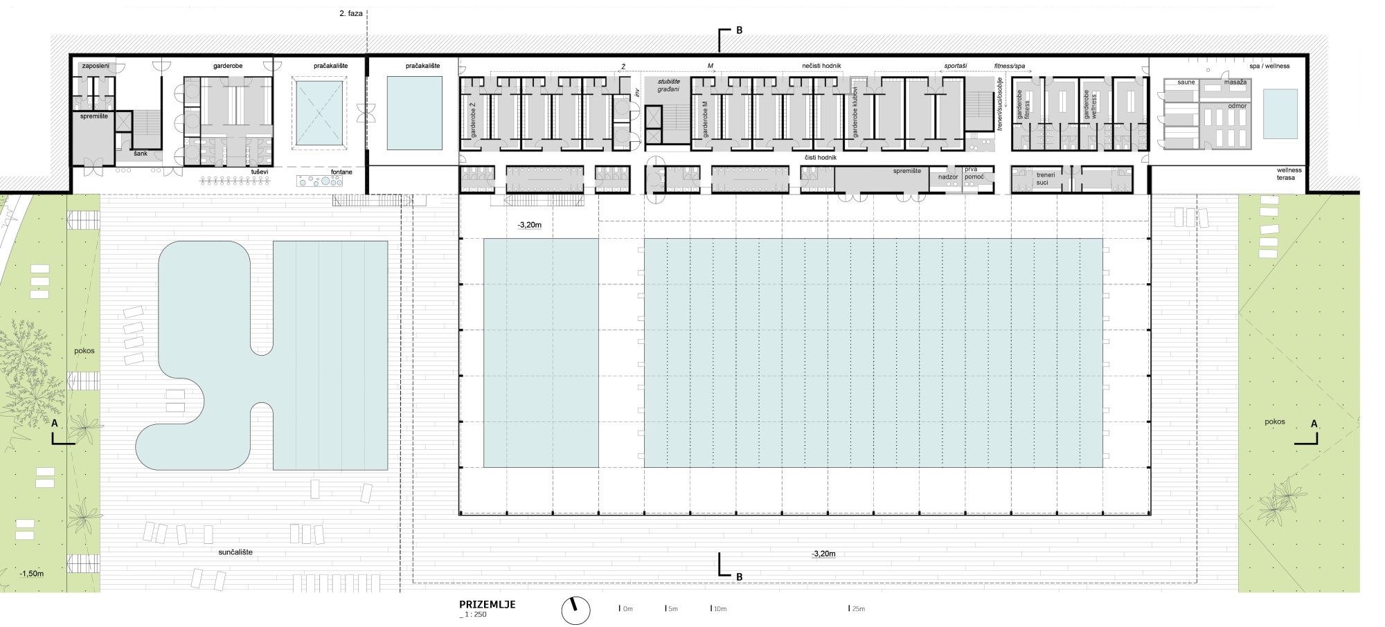 Ispod krova se nalaze svi javni sadržaji gradskog bazena: unutrašnji i spoljašnji bazeni smešteni su u topografski upuštenom terenu koji stvara zaštićenu zonu za boravak kupača, dok uzdignuta plato-lamela prema severu skriva servisne, a otvara ulazne sadržaje prema prostorima bazena i prirodi.
