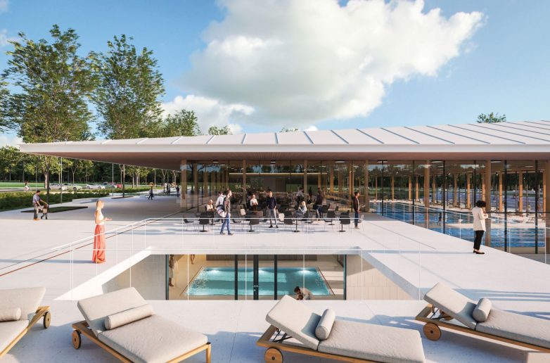 „Na taj način oblikuje se jasna podela na ‘viši’ ulazni deo s spoljašnjim pristupnim trgom i parkiralištem i ‘niži’ deo sa skrivenim servisima i bazenima. Staklena opna omogućuje kontinuirane vizure prema šumi i sportskim zonama na otvorenom”, objašnjava žiri.