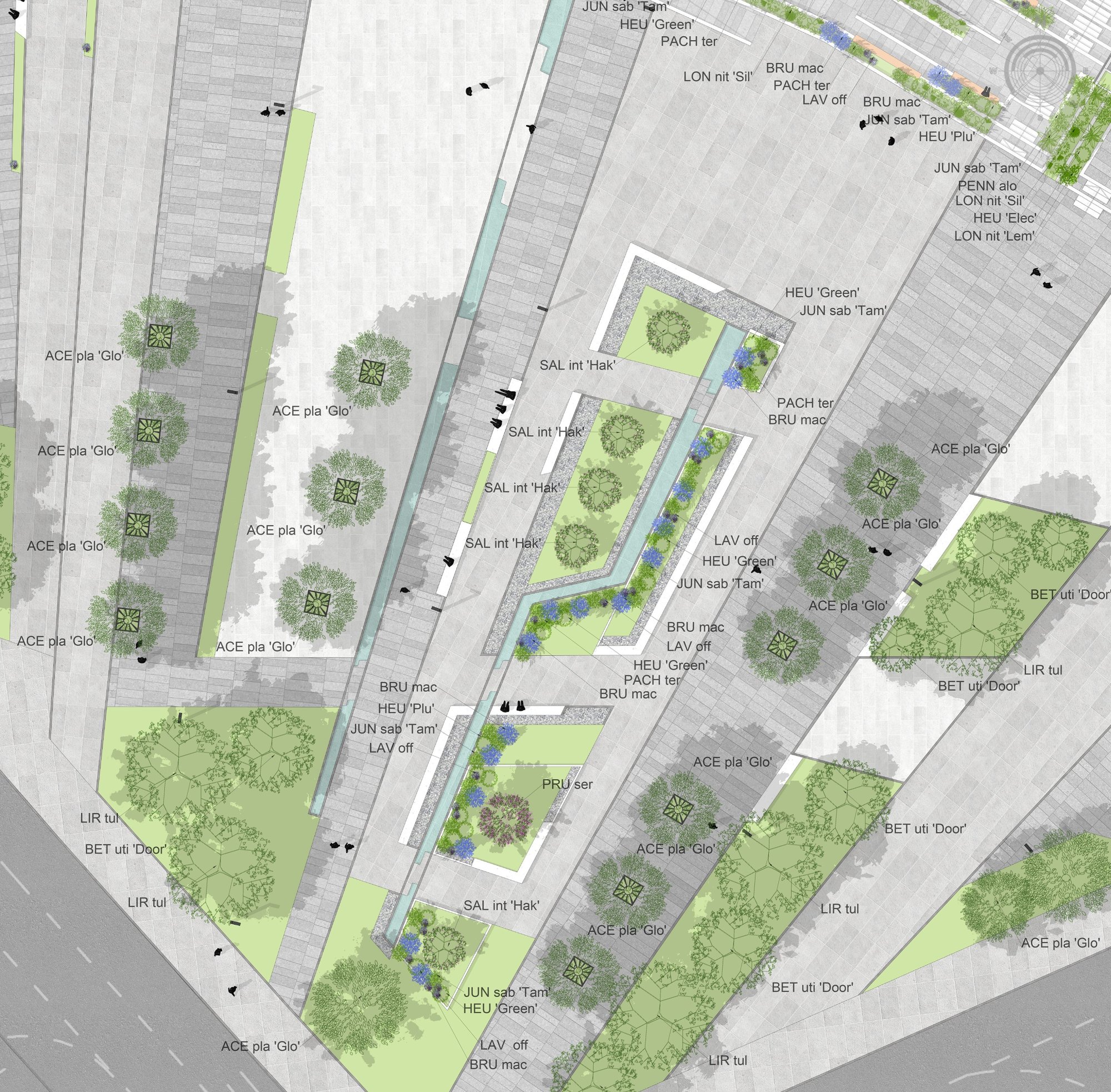 Na ovaj način je stvorena osnovna prostorna podela trga na zonu na nivou kote sadašnjeg platoa, koja predstavlja slobodnu površinu i prožeta je zonama sa popločanjem, zelenilom i vodenim trakama i denivelisan plato u nivou suterena obogaćen raznovrsnim sadržajima. Prostor ispred hotela Lim i ulaza u objekat, nekada planiran kao Dom kulture, zamišljen je kao slobodna popločana površina rasterećena od sadržaja, namenjena dešavanjima i manifestacijama sa većim brojem posetilaca.