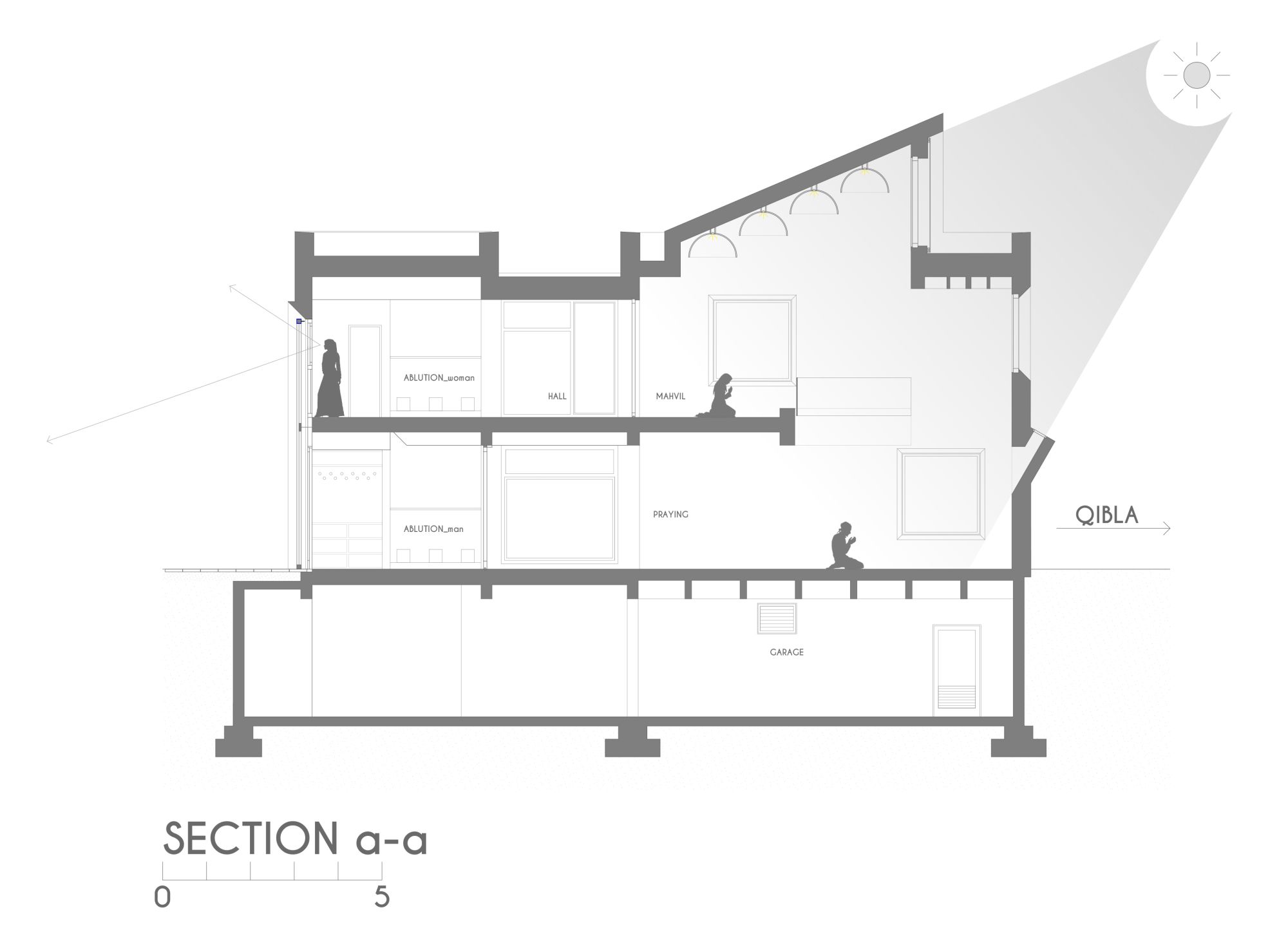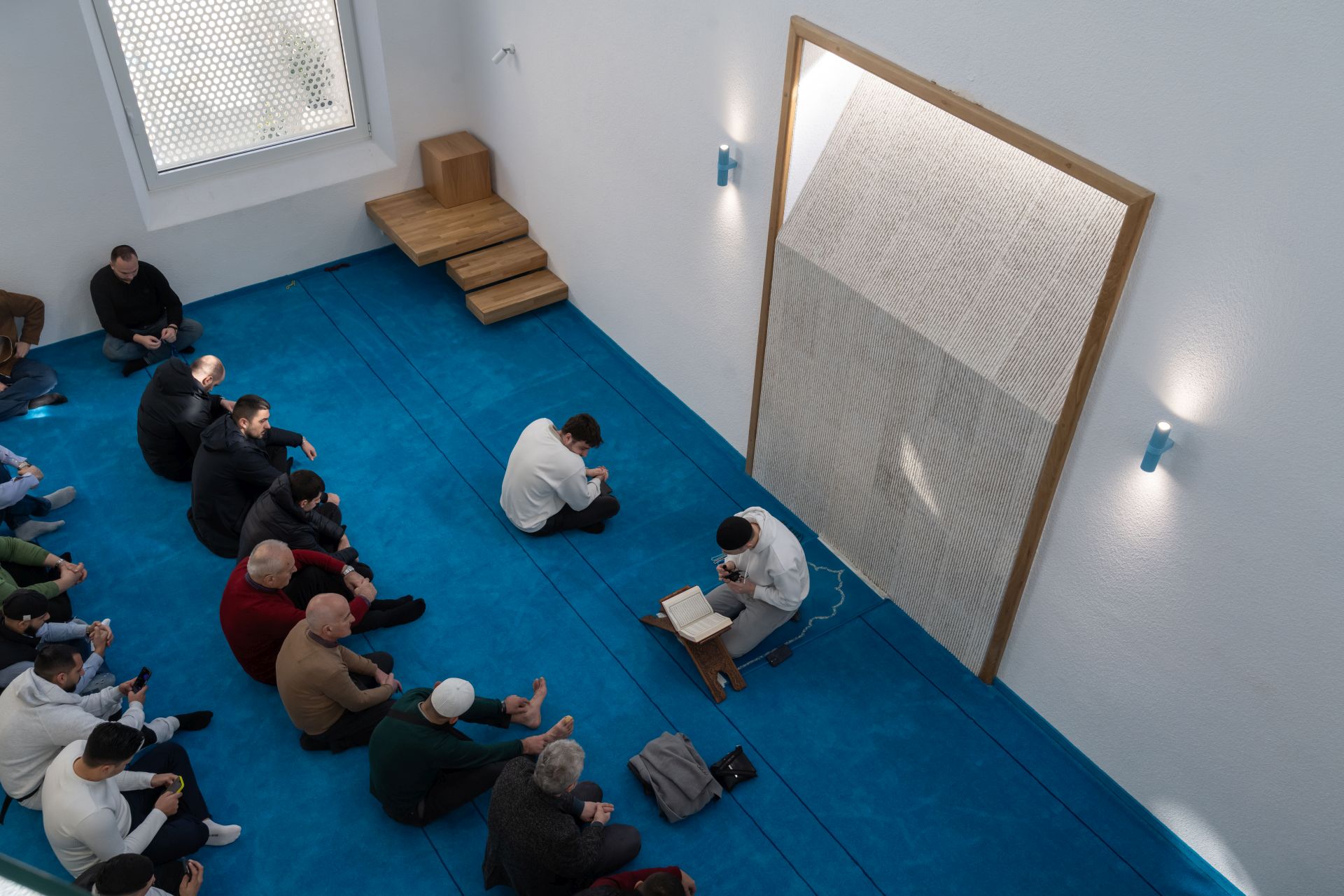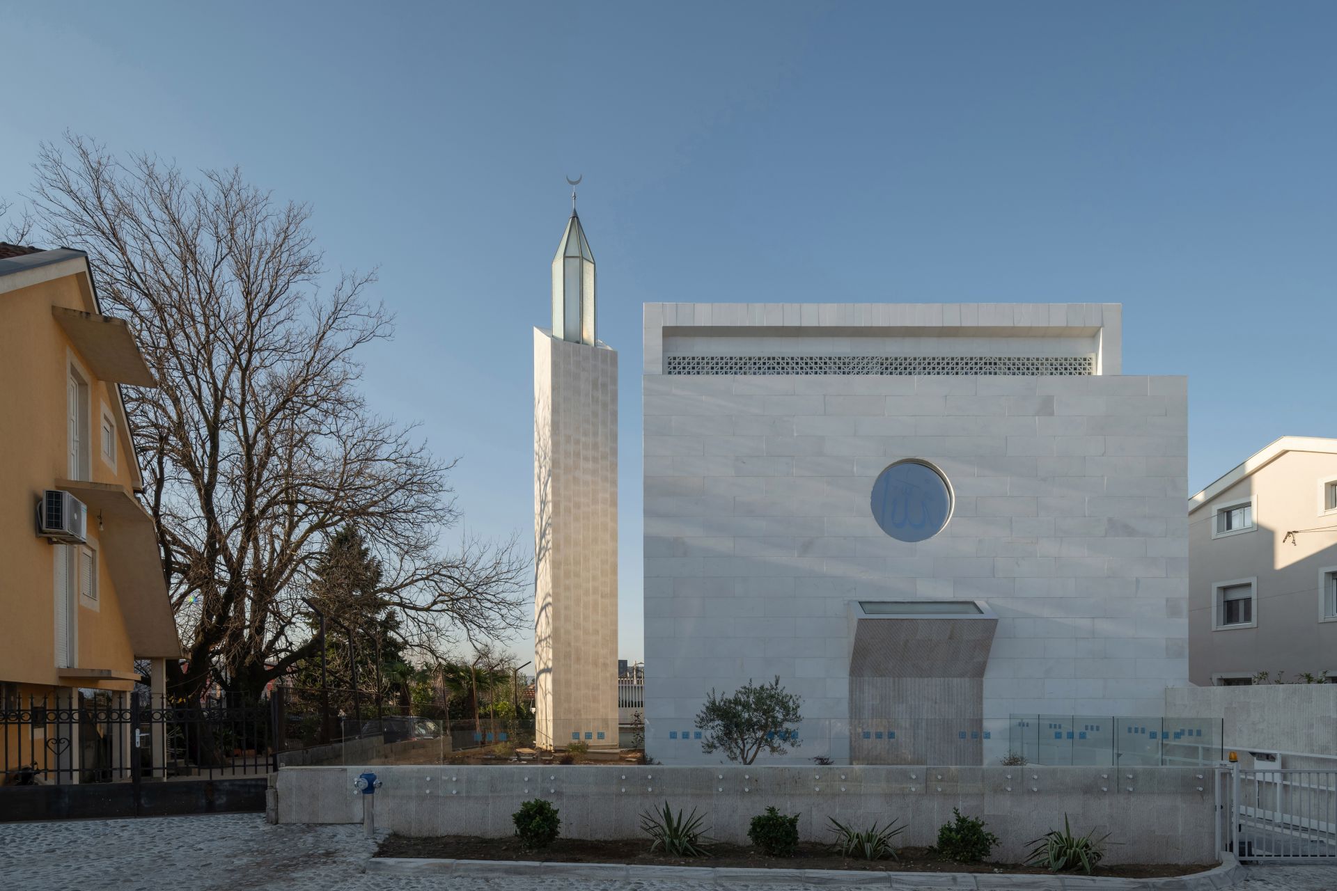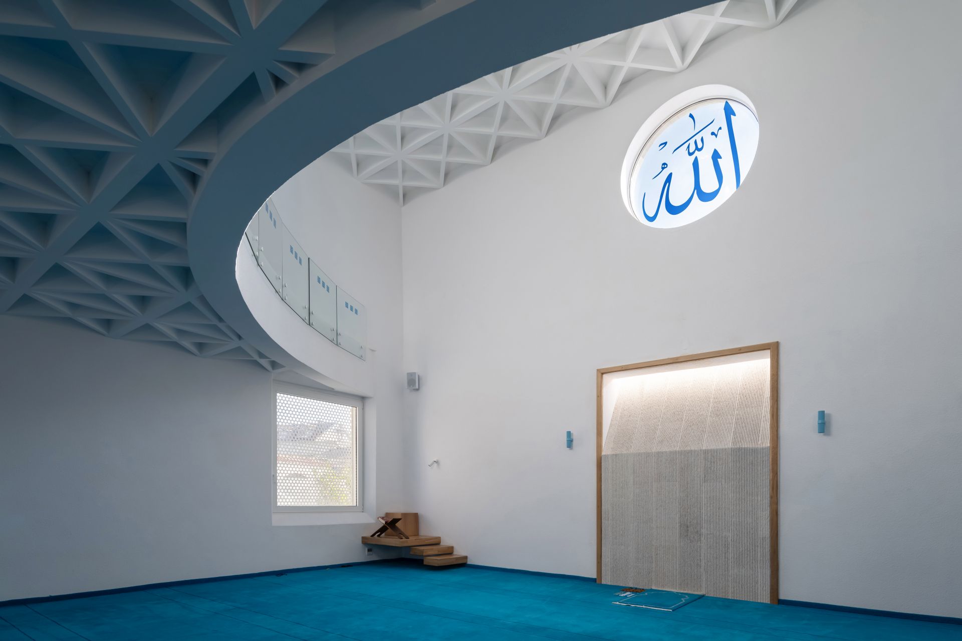 U sinergiji sa minaretom, kompozicija objekta formirana je od dva povezana volumena: jedan je namenjen verskom obredu a drugi za potrebe obrednog pranja i sanitarija. U njemu se nalazi i glavna ulazna partija u prizemlju.