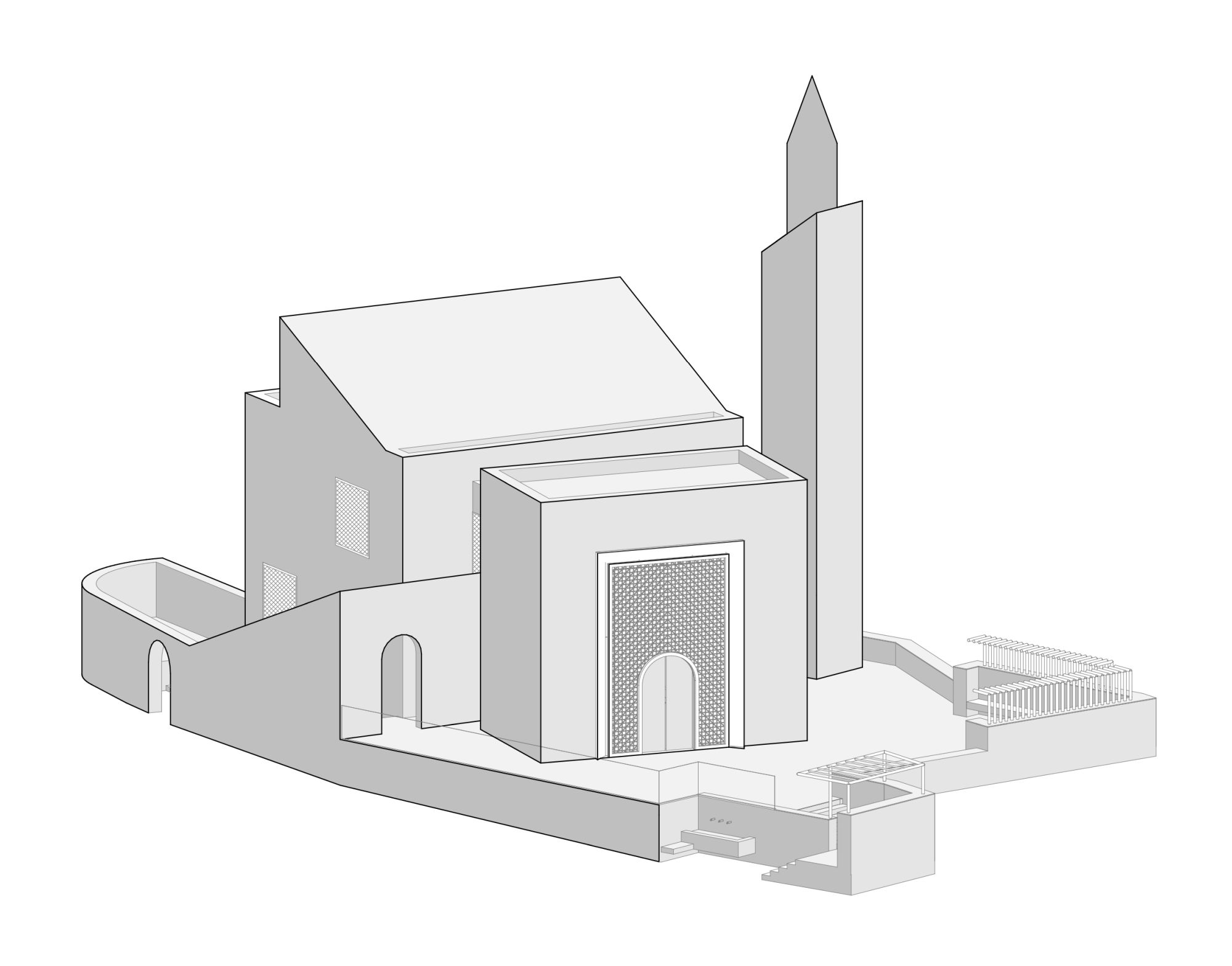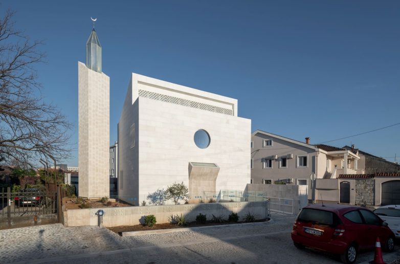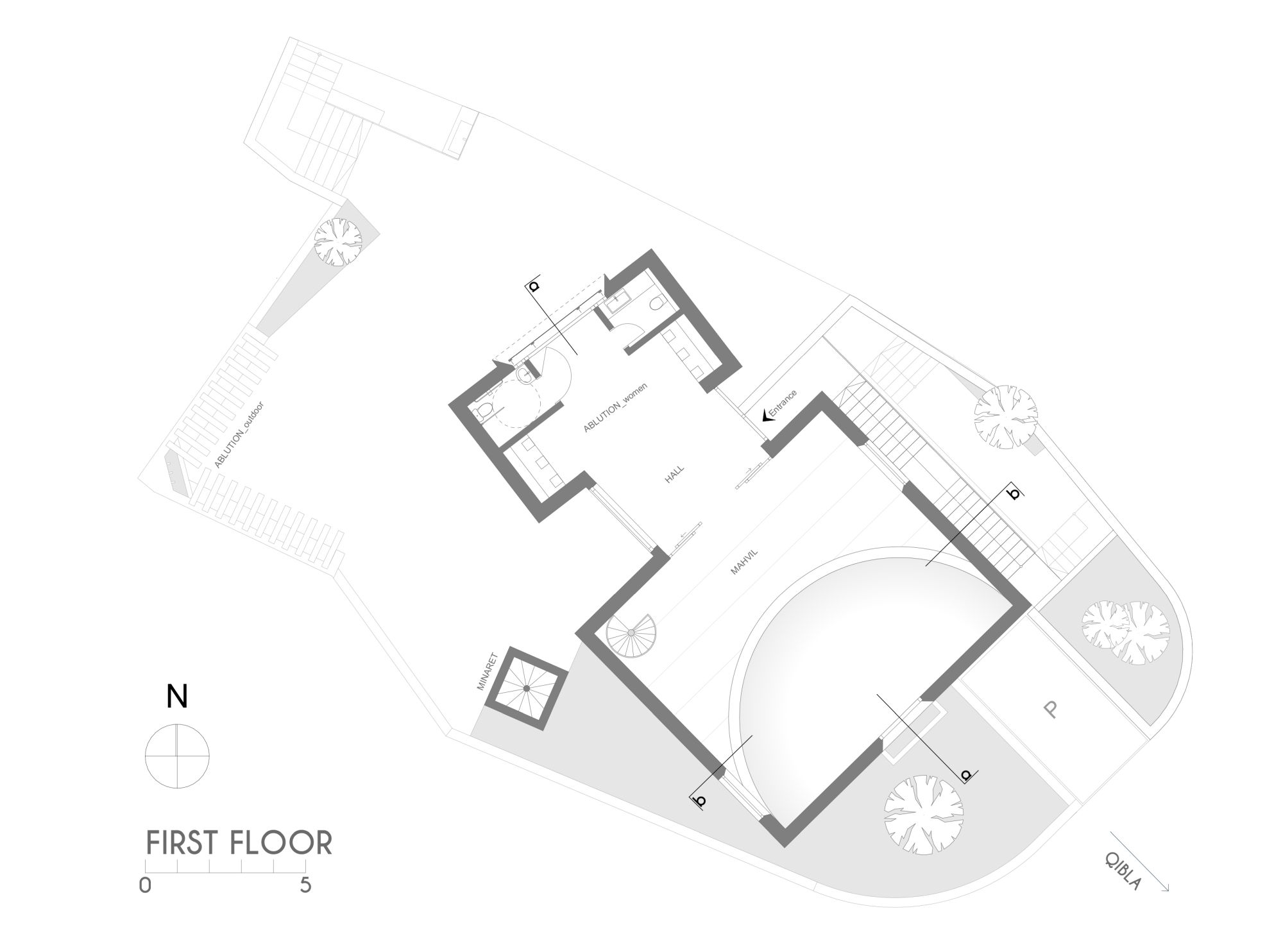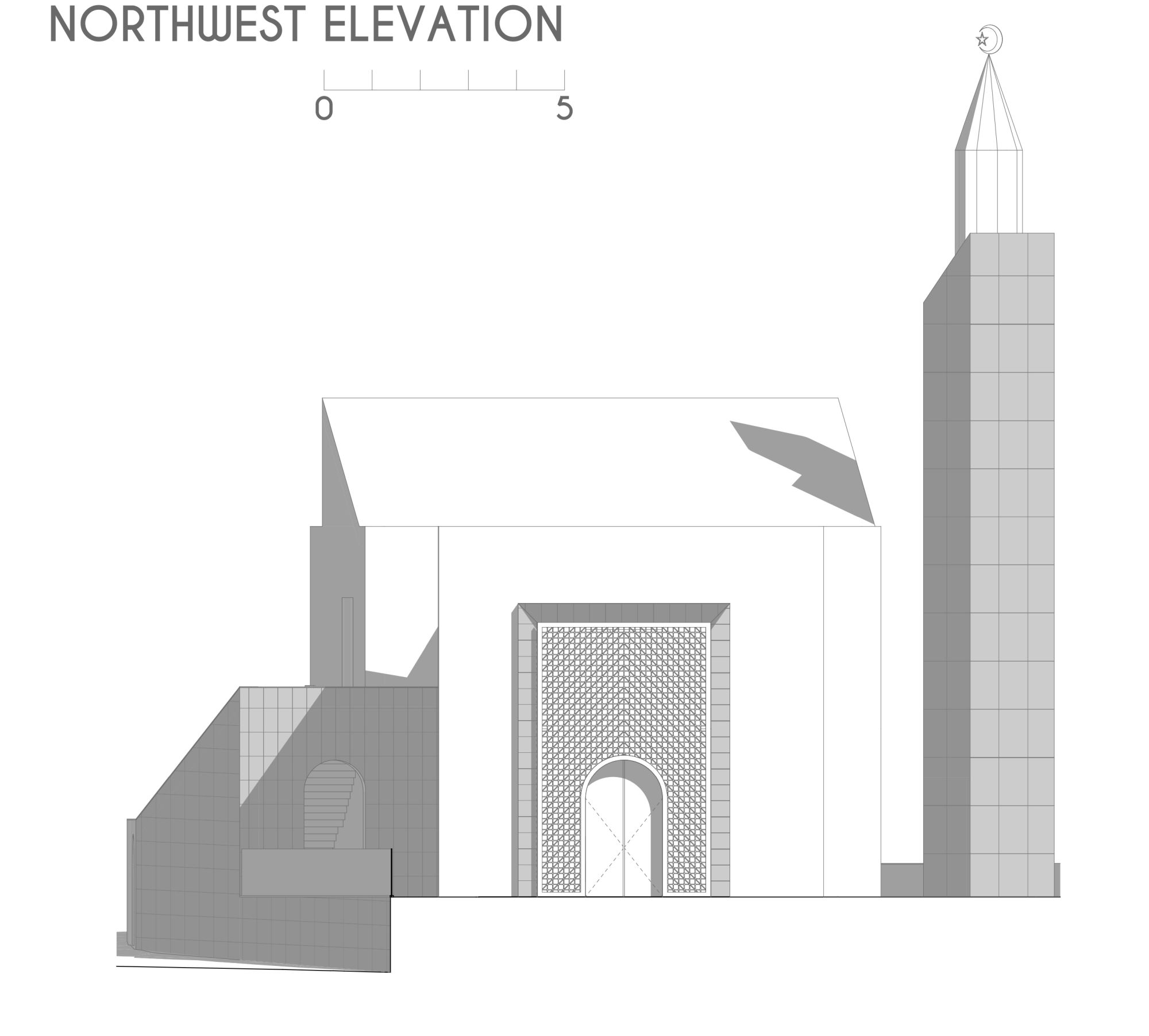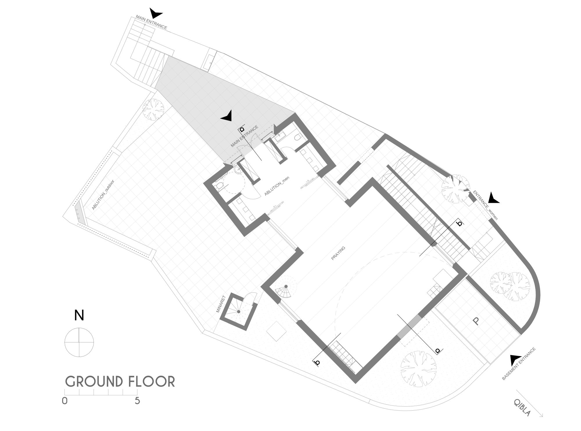 U sinergiji sa minaretom, kompozicija objekta formirana je od dva povezana volumena: jedan je namenjen verskom obredu a drugi za potrebe obrednog pranja i sanitarija. U njemu se nalazi i glavna ulazna partija u prizemlju.