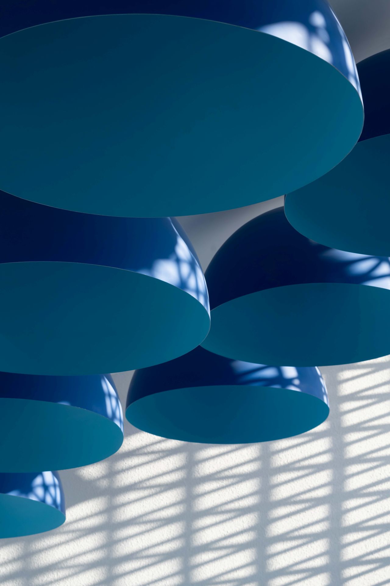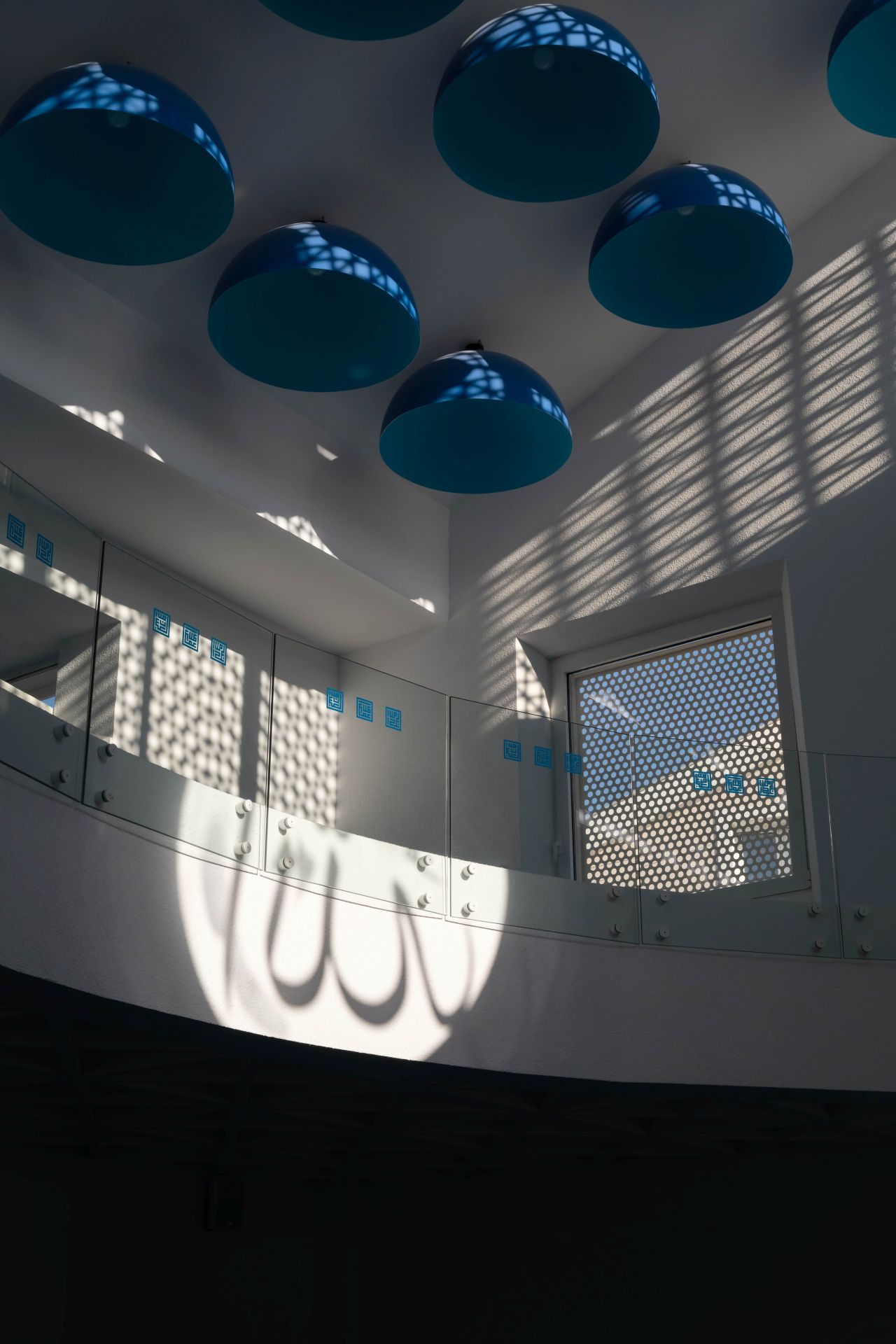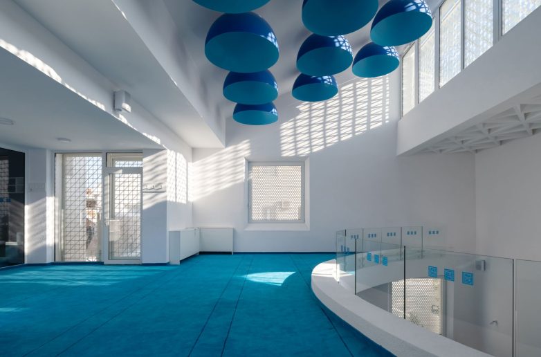 Primena drvenih elemenata na njima je data sa ciljem ukazivanja na njihovu posebnost u prostoru i stvaranjem doze topline. Belina zidova i monohromatika plavog tepiha su ciljano ostavljeni, kao scena za igru senki i svetlosti sa prozora i, noću, sa 18 poluloptastih lustera sa kosog plafona čija je boja usaglašena sa prostirkama na podu.