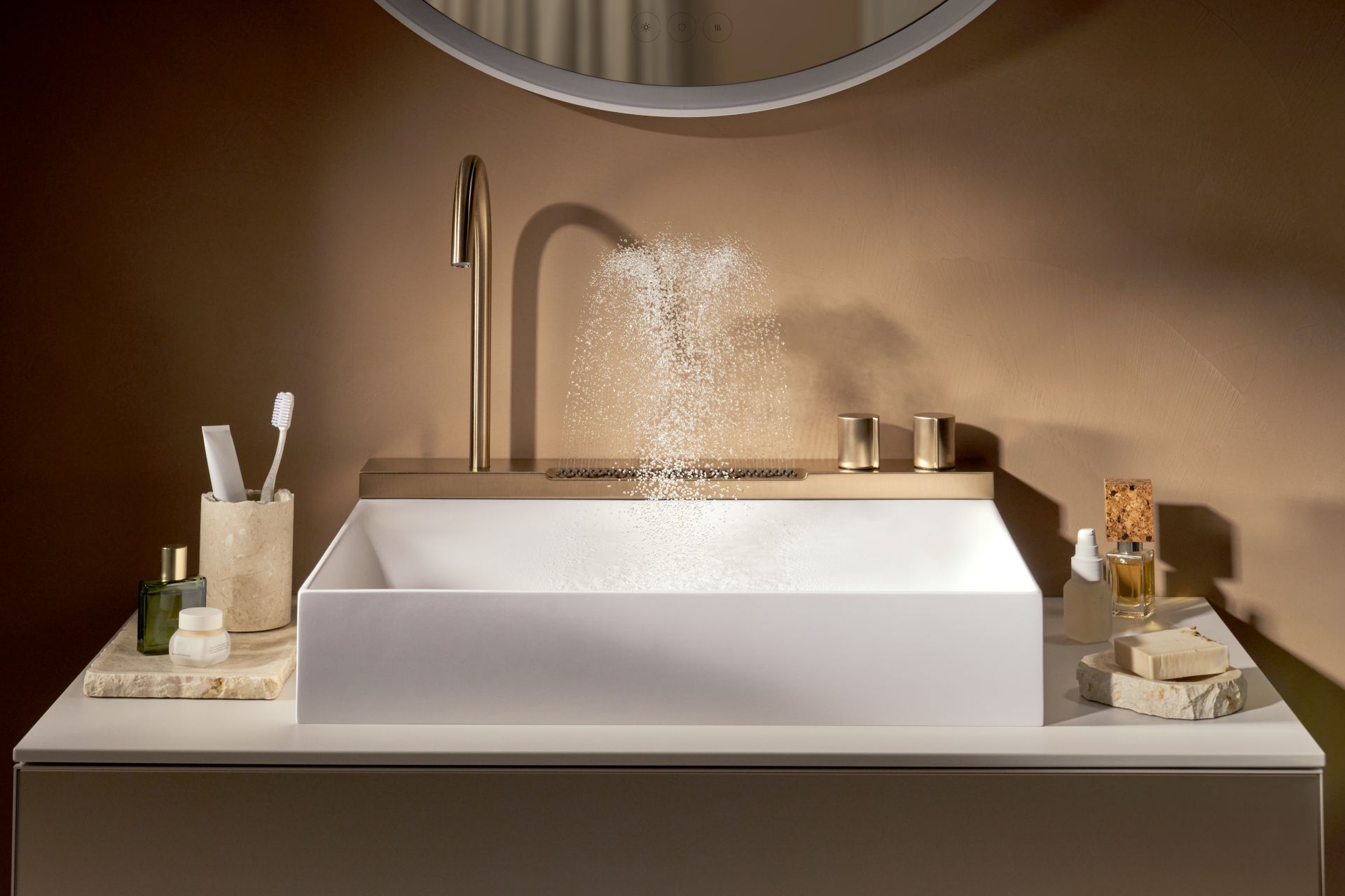 Integrisani regulator pritiska smanjuje potrošnju vode na pet litara po minutu za tuš, čime se podstiče održivo korišćenje vode. U oba slučaja, voda se nežno prikuplja iz umivaonika načinjenog od kompozita čvrste površine – Solid Surface.